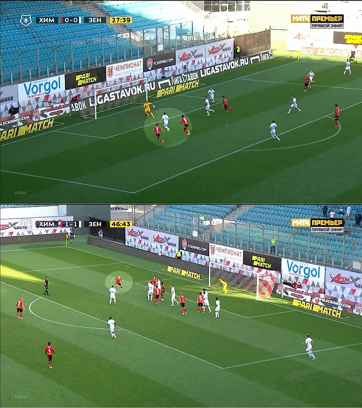 Давление и контрпрессинг «Зенита» оказались эффективнее: перехват Кузяева привел к моменту Ерохина (плюс была возможность вывести Азмуна на удобную позицию, но Далер сыграл проще), прессинг после аута спровоцировал атаку перед пенальти, подборы привели к голу Вендела и эффектному выстрелу Ерохина, а другие перехваты переводили гостей в режим длительных позиционных атак.
