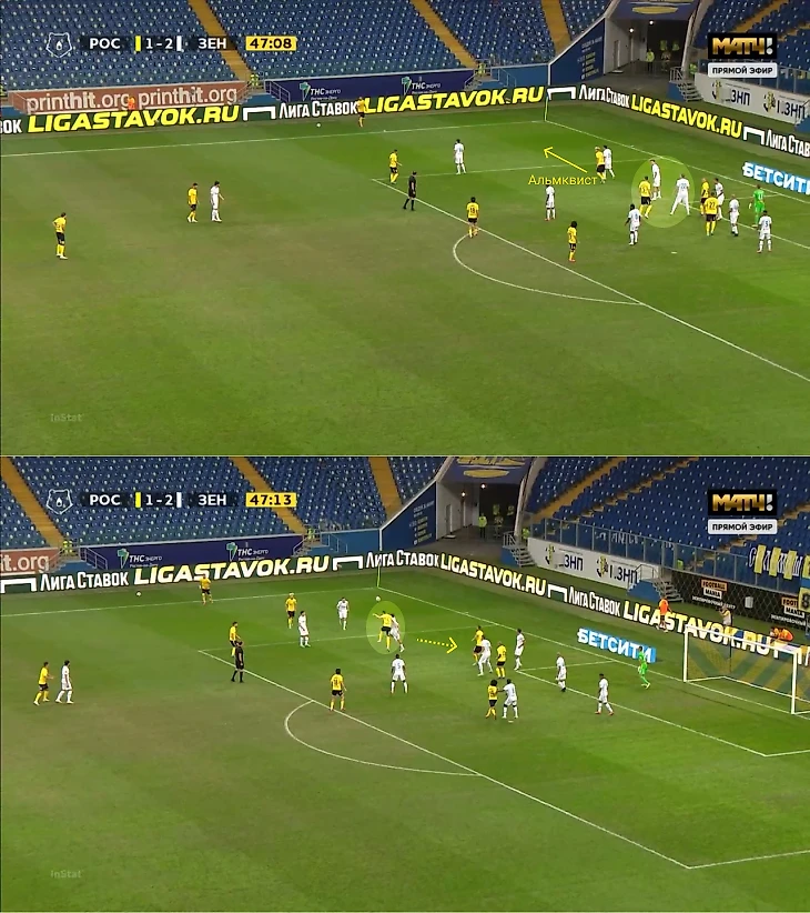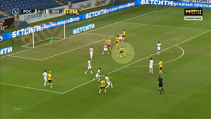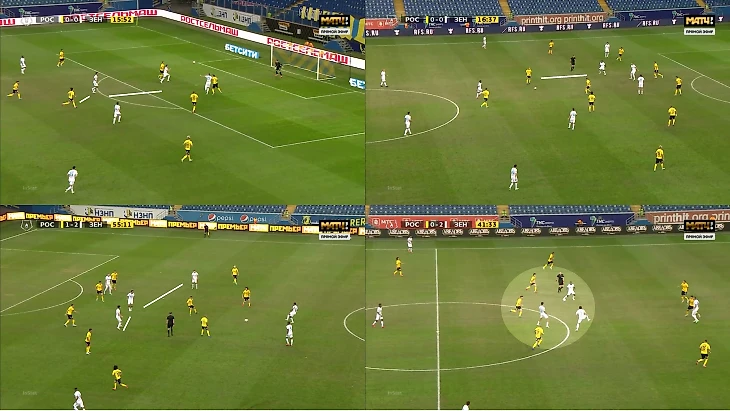 Еще «Ростову не хватало плотности в центре. Ниже – несколько скринов, где видно, что игроки «Зенита» за спинами полузащитников «Ростова».