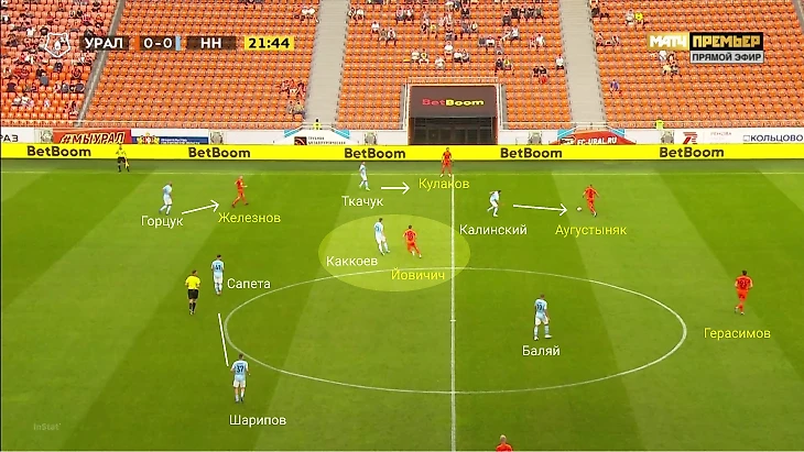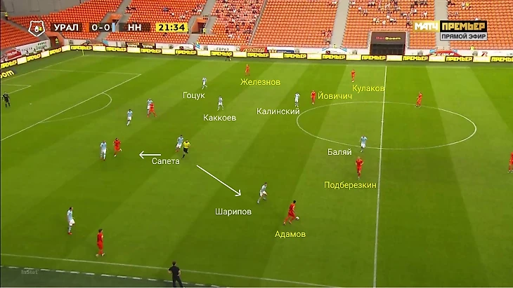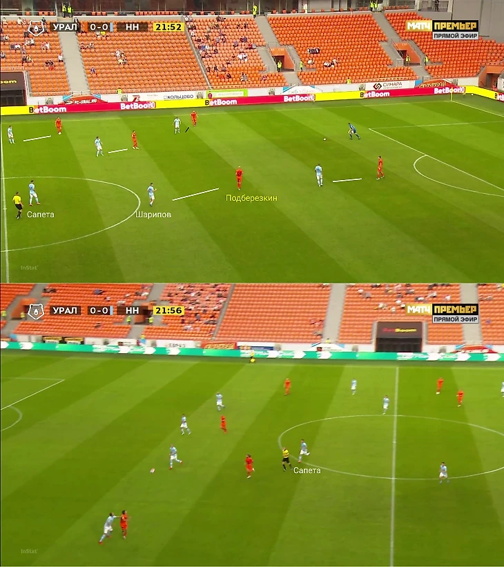 Эпизод завершился новой подстройкой и последующим выносом в аут: движение Подберезкина блокировал Шарипов, а все это страховал Сапета. Сзади «Нижний был в выигрышной ситуации ситуации: «Урал» проигрывал борьбу, к эпизоду смещались защитники и Сапета.