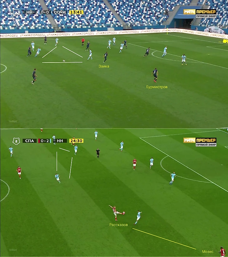 Плюс – реакция Кержакова на происходящее. Против «Сочи» Кержаков ушел с 5-3-2, перейдя на 5-4-1 (вышедший Горбунов доигрывал за Нобоа и Цаллаговым в полуфлангах и по центру). Похожий ход был со «Спартаком», когда уже в середине первого тайма «Нижний» стал активнее оборонять фланги.