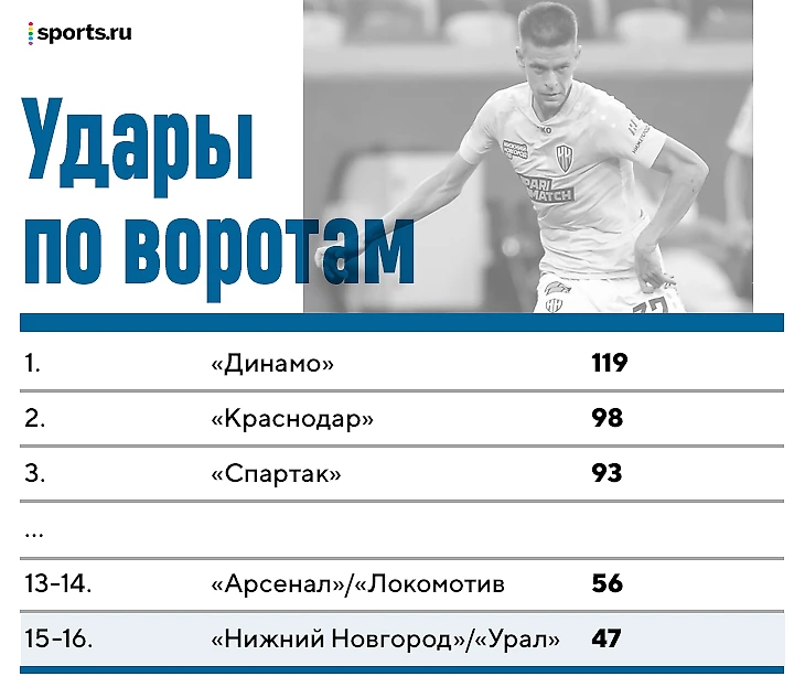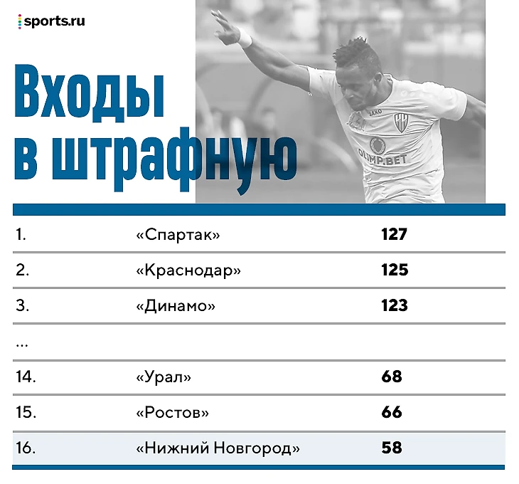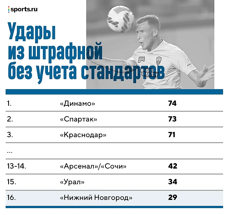 Мяч практически не доходит до нападающих. «Нижний» – худшая команда лиги по ударам из штрафной без учета аутов, штрафных и угловых. Балай и Сулейманов – в топ-10 нижегородцев по проведенным минутам (Балай – четвертый, Сулейманов – восьмой), но албанец нанес всего 4 удара, а россиянин – 7 (на двоих 5 ударов из штрафной с игры).