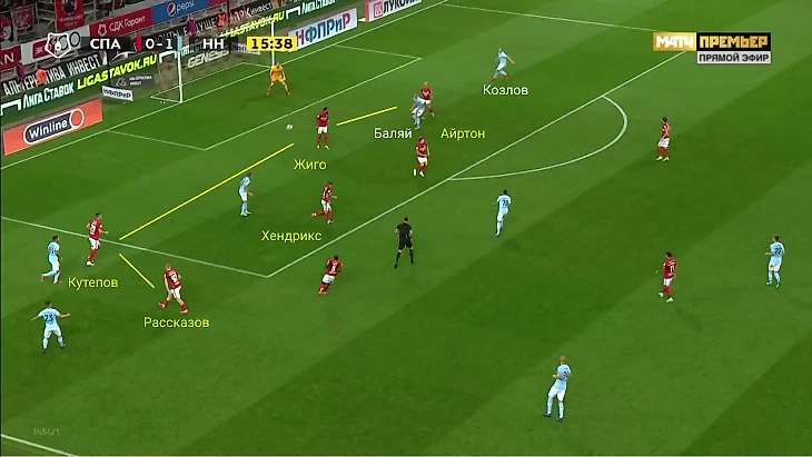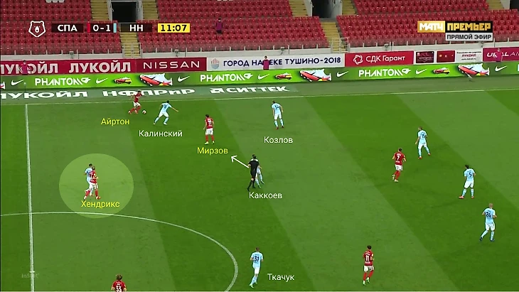 Вот как страдал «Спартак»: центральный полузащитник Калинский встретил Айртона, Козлов подхватил Мирзова, к эпизоду сместился опорник Каккоев – получилось 3-в-2 в пользу «Нижнего». Дополнительная фишка – опека Хендрикса от Сулейманова. Все варианты перекрыты, поэтому Айртон прорвался по флангу. Козлов в последний момент его притормозил, поэтому бразилец перевел игру направо.