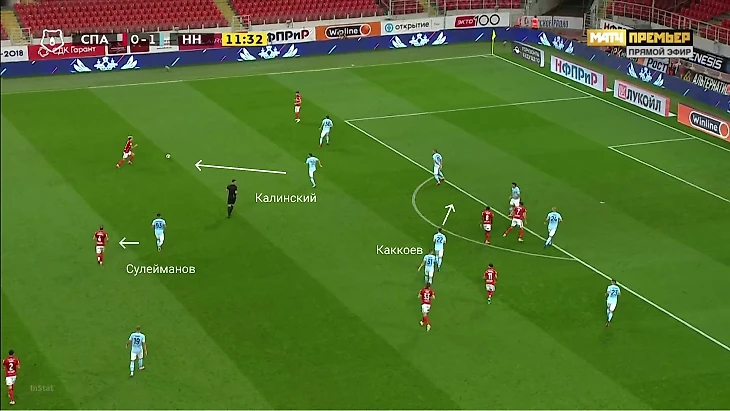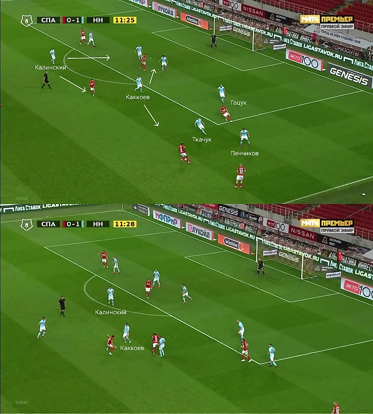 Затем структура чуть сдвинулась: Аугустыняка встретил Калинский, Кулакова – Ткачук, Железнова – Гоцук, а Каккоев подхватил Йовичича (с ним до этого был Калинский). В итоге «Нижний» вновь получил структуру, где свободны два полузащитника, готовые сместиться по цепочке к эпизоду. Так «Нижний Новогород» сбивал темп, вынуждал играть забросами и работал на подстраховке.