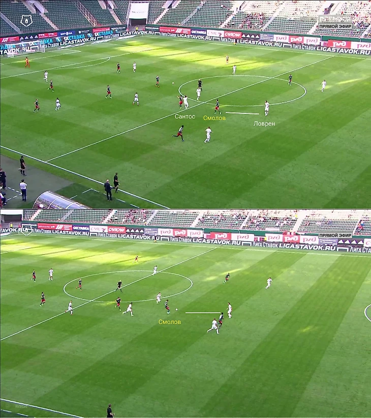 На флангах все просто: против двух фланговых игроков «Локо» действовали Караваев-Малком/Сантос-Вендел.