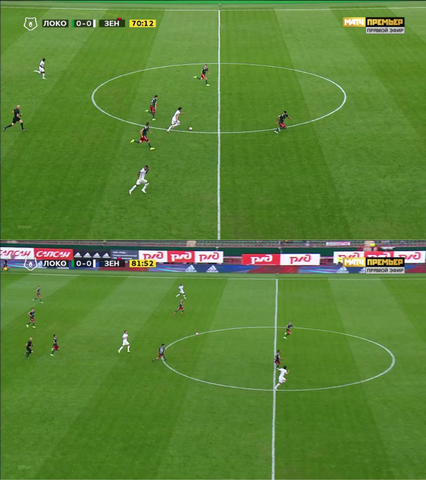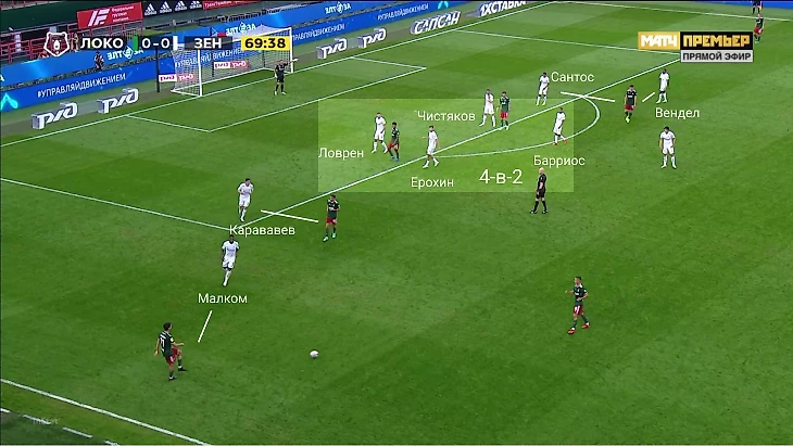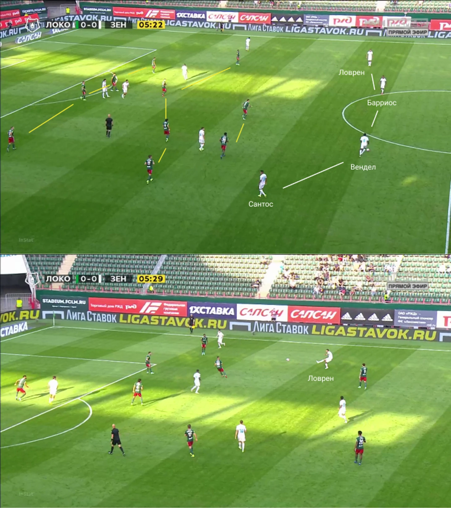 Общий пример: Малком и Караваев встречали Рыбчинского и Тикнизяна, в центре у «Зенита» преимущество 4-в-2, чуть правее Дуглас и Вендел закрывали Жемалетдинова. «Локо» долго перекатывал мяч с одного фланга на другой, а затем потерял мяч и напоролся на контратаку