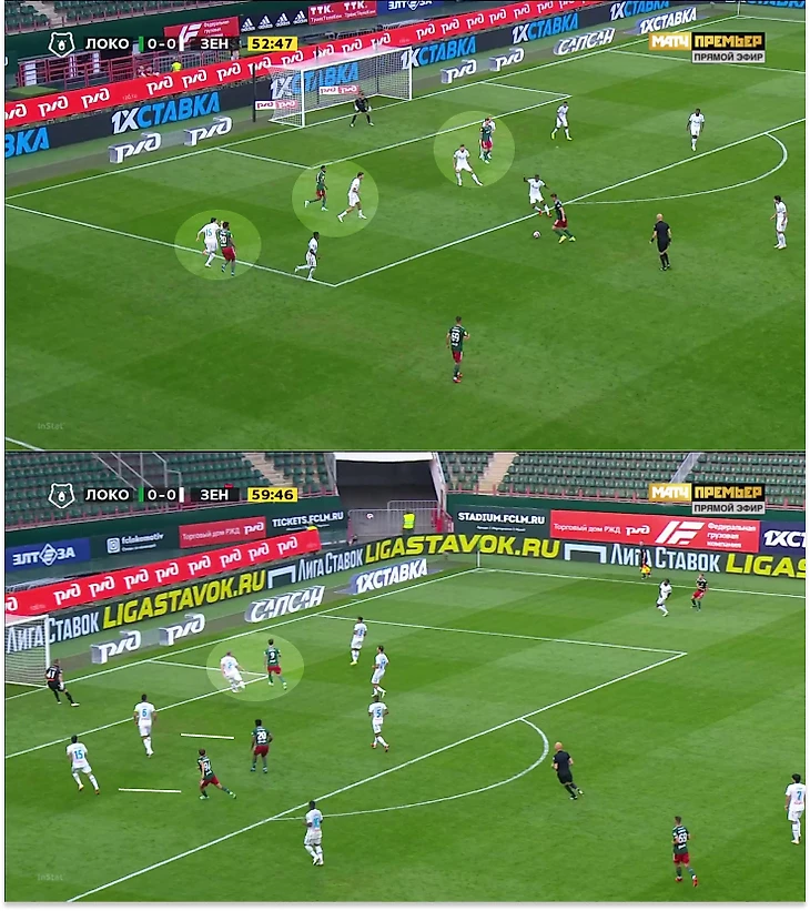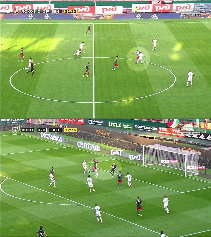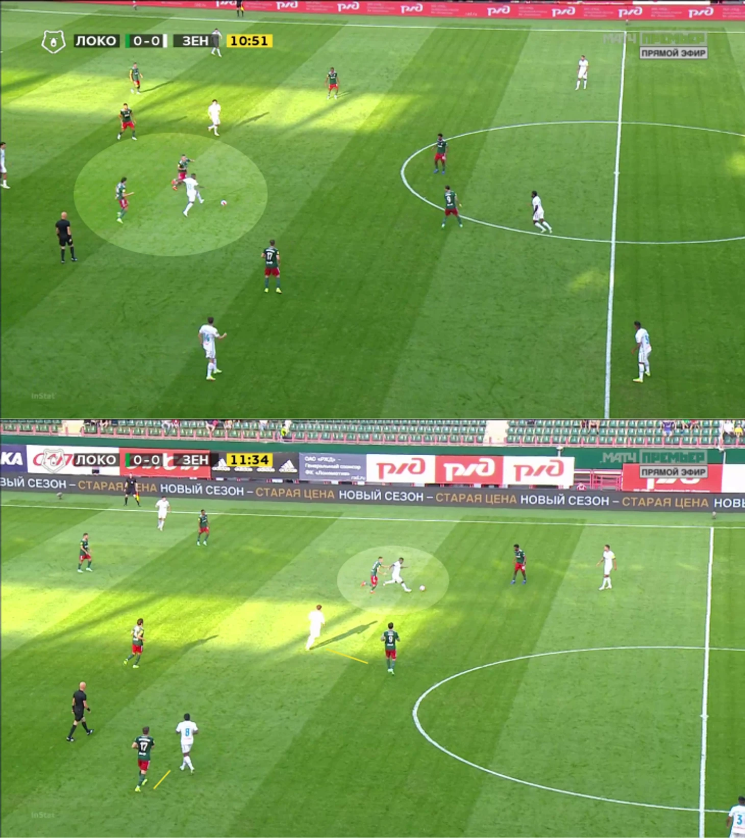 В чемпионском матче и в игре за Суперкубок «Зенит» одинаково оборонялся: выстраивал 4-4-2, вингеры узко располагались, пространство между линиями было минимальным, плюс при фланговых атаках центральные полузащитники смещались к эпизоду, а крайние полузащитники доигрывали за оппонентами до штрафной – так «Локомотив» ничего не создавал в позиционных атаках, пробивая только издали или после стандартов.