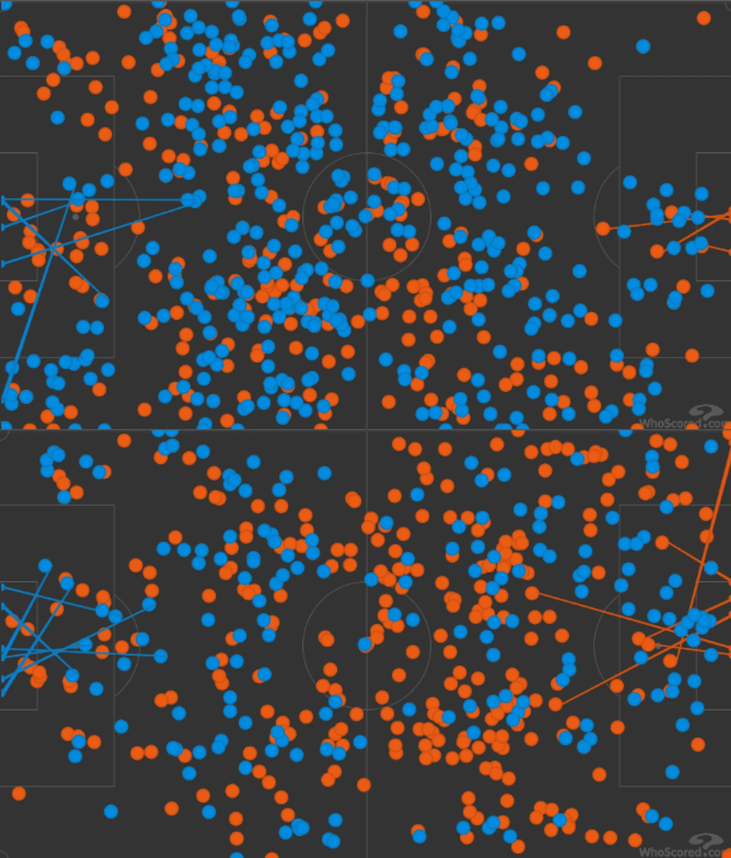 В итоге карты касаний «Локо» за первый и второй таймы практически идентичны («Локомотив» выделен синим, ворота «Зенита» – справа): хозяева не контролировали чужую опорную зону, атакуя только на стандартах.