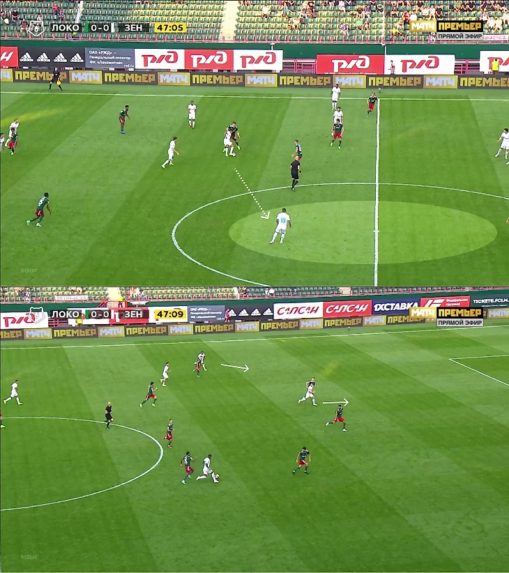 Отдельная помощь исходила от Малкома и Вендела. Они находились в узких позициях, играя параллельно штрафной – так они создавали дополнительную плотность. При переходах из центра на фланг принцип очень помогал: вингер встречал соперника на краю, к нему приходил опорник (если «Локомотив» перегружал пространство перед штрафной), а вингер с другого фланга сохранял линейную компактность.