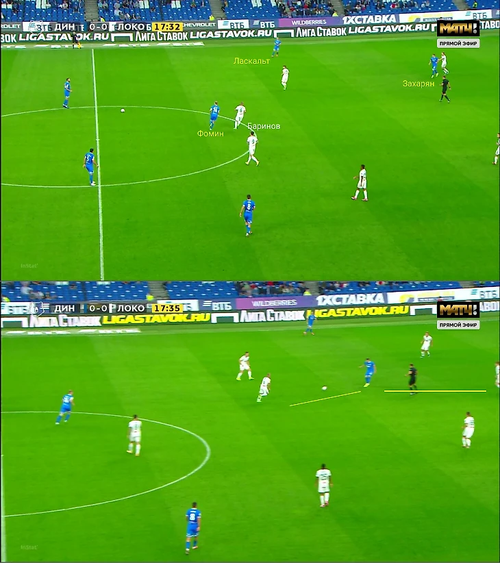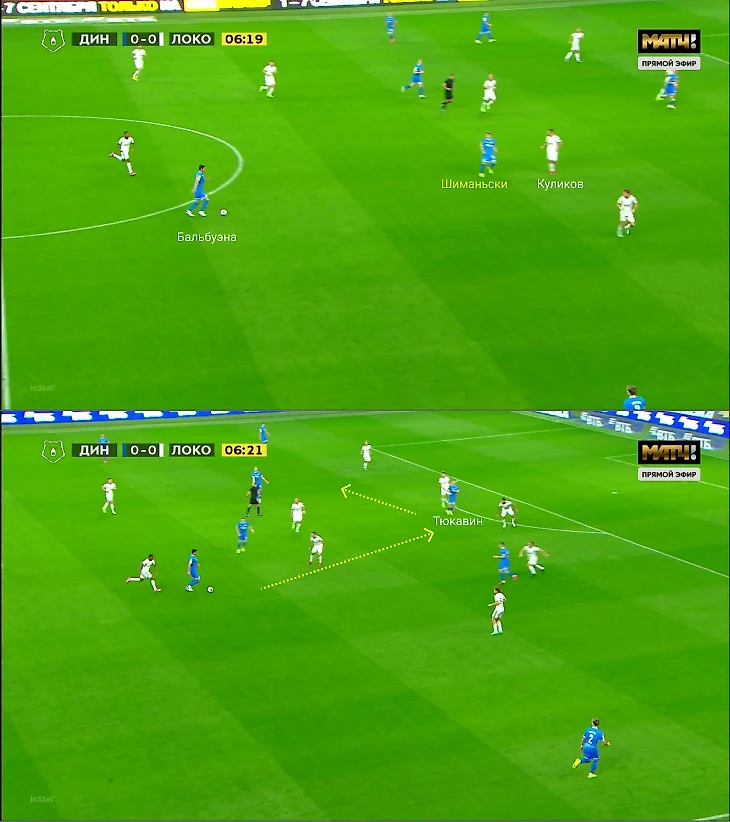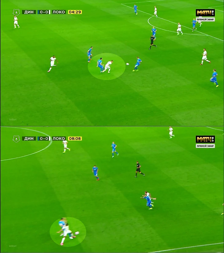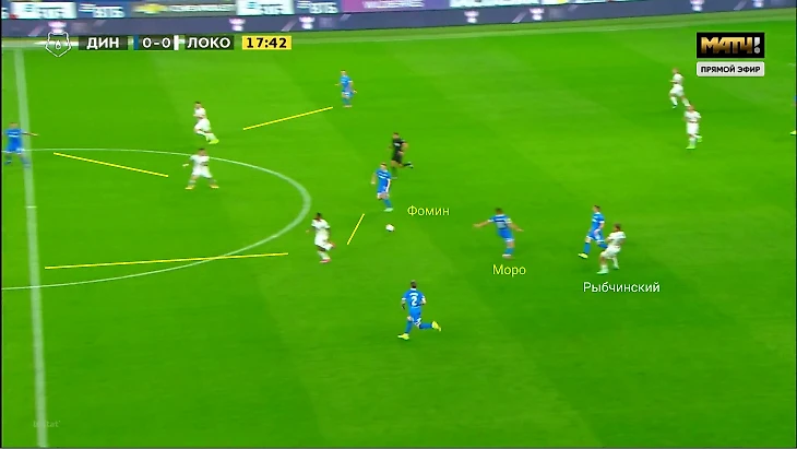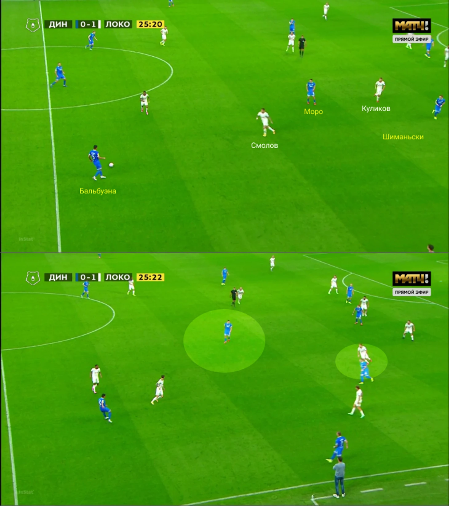 Прохождение прессинга – значимый паззл вчерашнего матча. В начале «Локо» хорошо подстроился под движение «Динамо». Основной триггер прессинга – мяч в ногах у Бальбуэна или Ордеца. Одного из них встречал нападающий, основная цель – встретить так, чтобы закрыть перевод на другого центрального защитника или противоположный фланг.