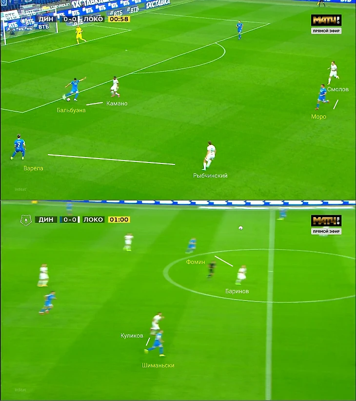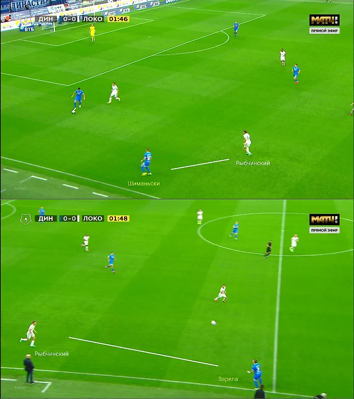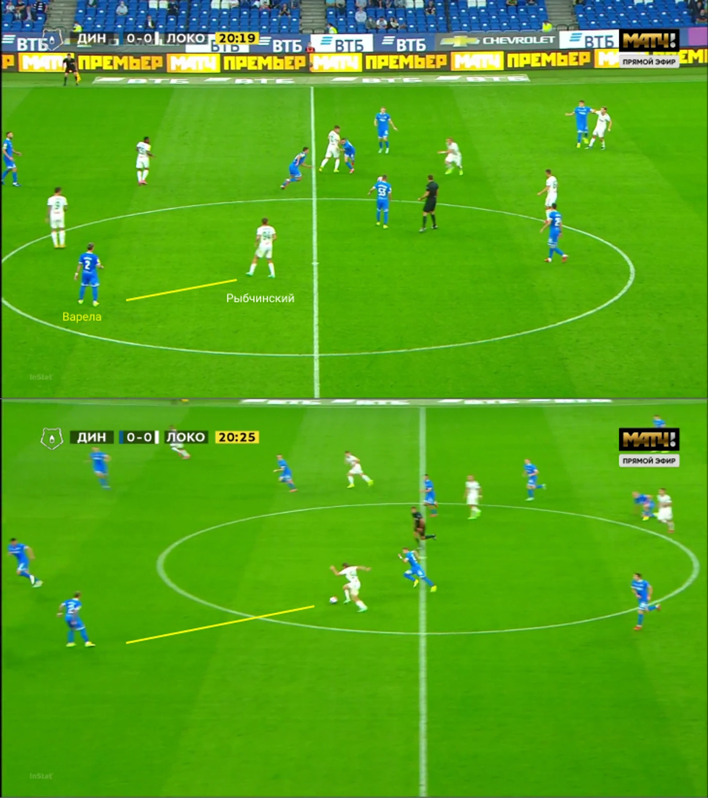 А здесь «Динамо» сначала зажало «Локо» количеством, но затем проиграло борьбу. Варела в начальной стадии был с Рыбчинским, но во время борьбы сделал несколько шагов назад. В итоге россиянин получил мяч, разогнав атаку, во время которой Камано попал в перекладину.