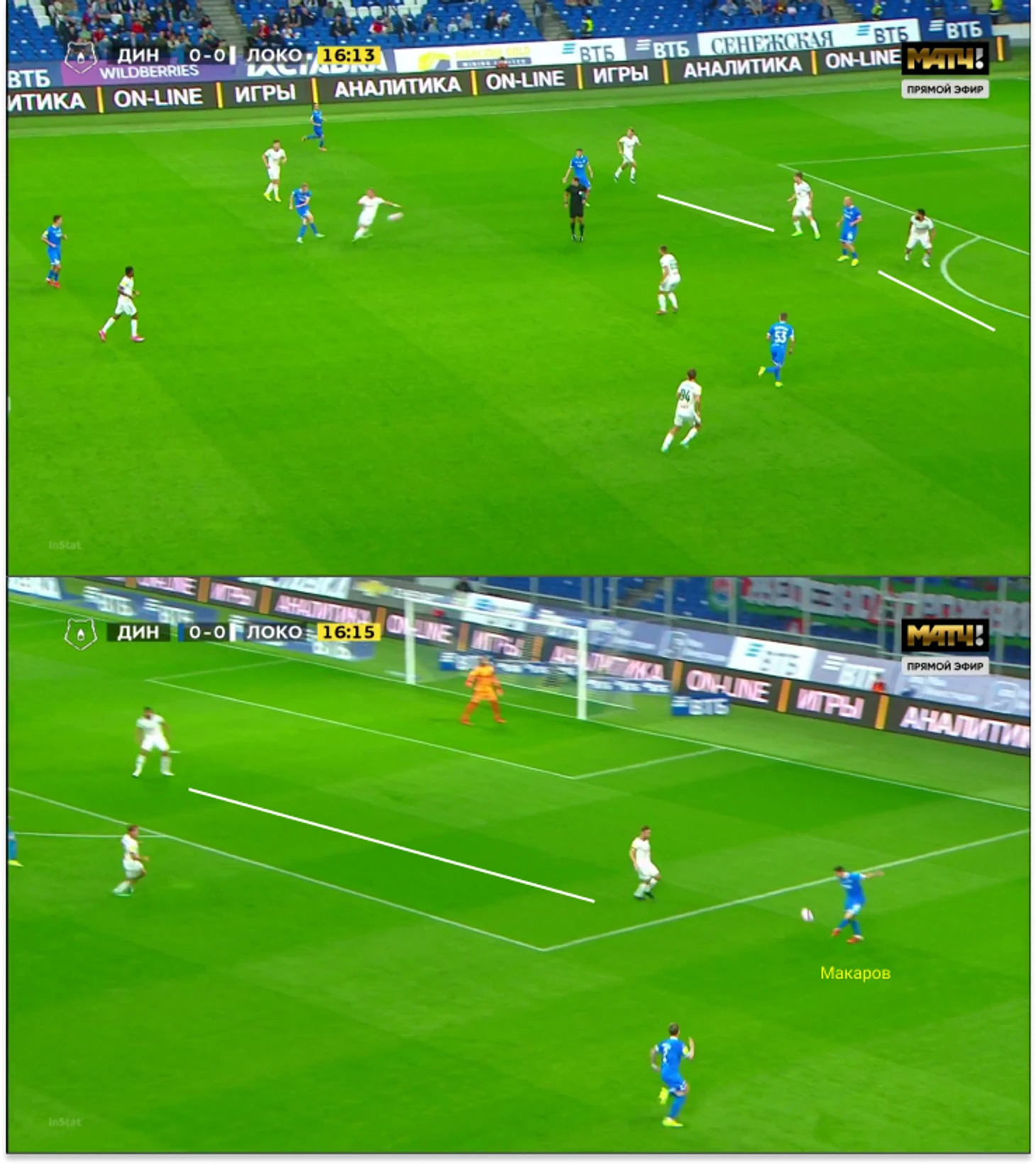 Для Макарова другие условия: «Динамо» грузит левый фланг, а на правом Денис держит ширину, оставаясь 1-в-1. В итоге он получает пространство для смещений под левую ногу.