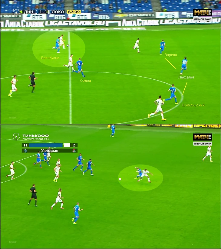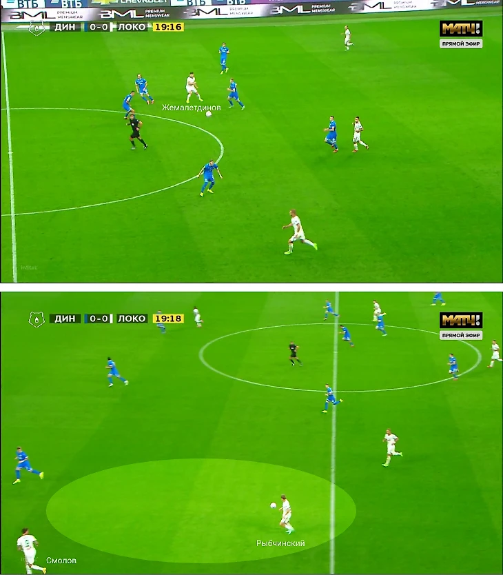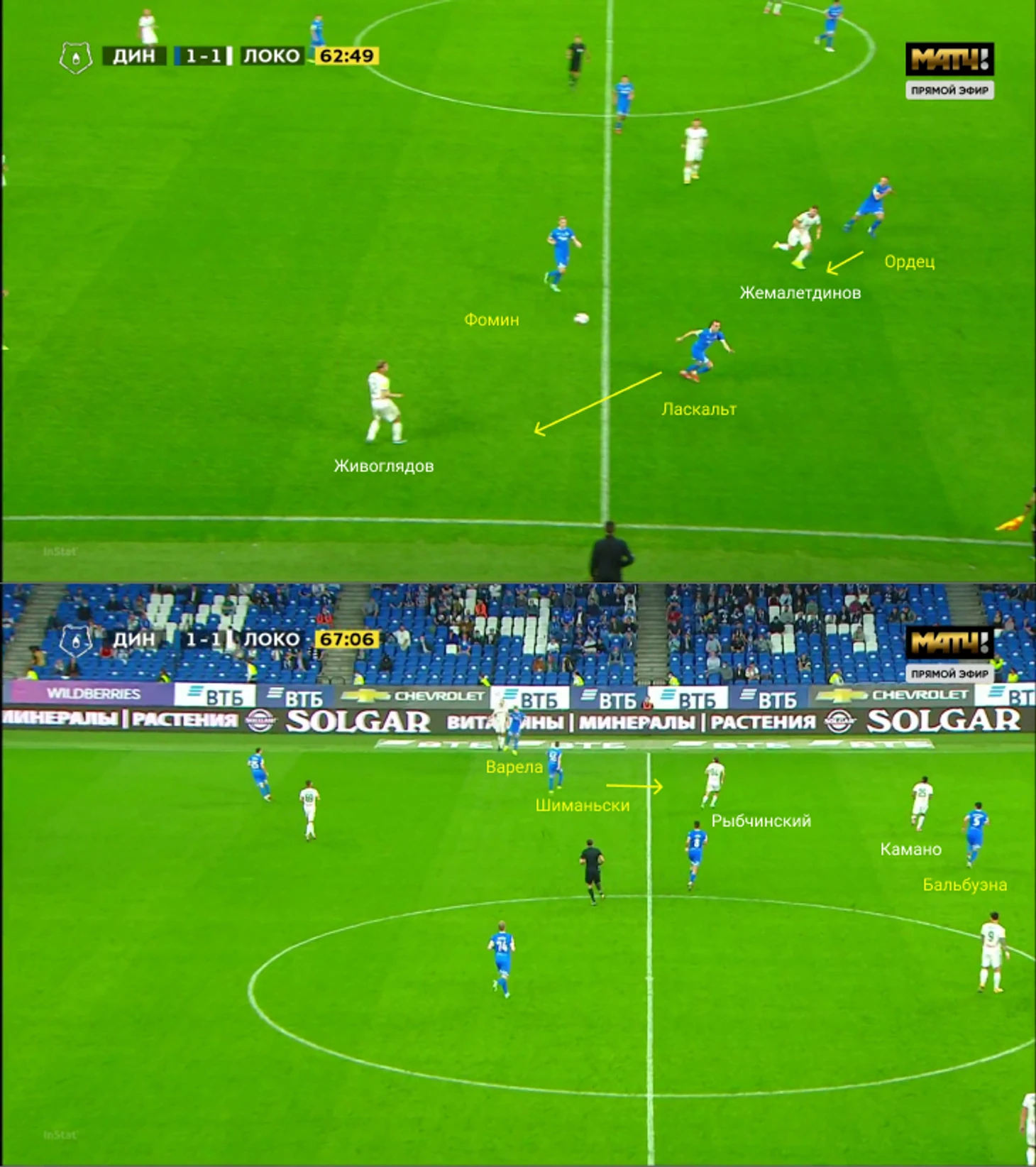 Во-первых, прессинг стал агрессивнее и выше. Во-вторых, он был направлен на крайних защитников. Например, если их не встречали вингеры, смело выбрасывались крайние защитники. Ласкальт и Варела встречали Живоглядова и Рыбуса, центральный защитник брал Камано или Смолова, а Шиманьский/Моро страховал из центра. Так «Динамо» выигрывало борьбу при забросах и выносах (во втором эпизоде Шиманьский изначально двигался именно к Рыбчинскому, но поменял решение во время прыжка Варелы).