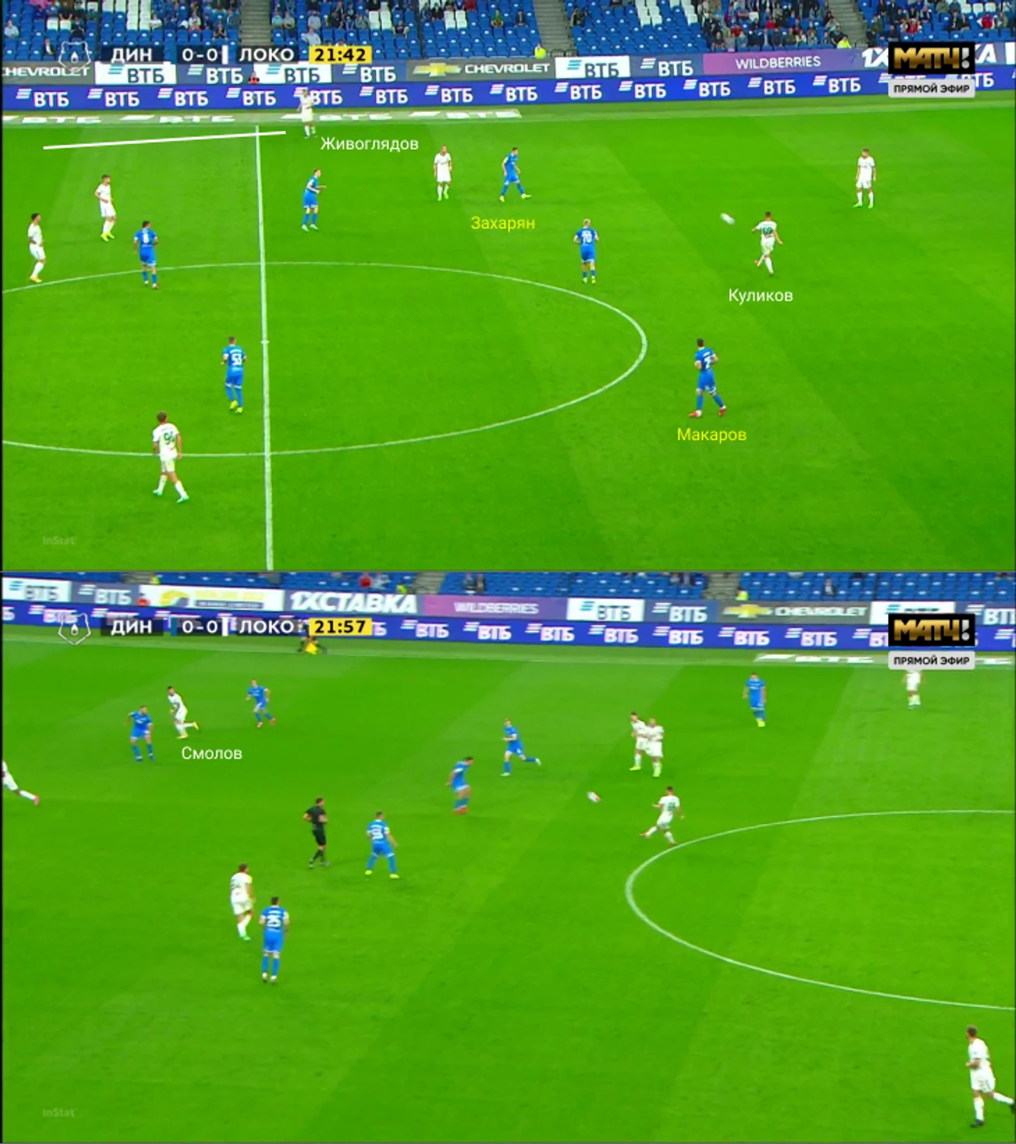 Голевая атака – не только мастерство Смолова, но и совокупность вышеупомянутых факторов. Сначала «Локо» позиционно атаковал, но это было стерильно (вингеры находились с крайними защитниками «Динамо»). Пара передач назад выгнала хозяев в прессинг и сняла давление с Живоглядова и Рыбуса. Куликов это прочувствовал и перевел на Живоглядова.
