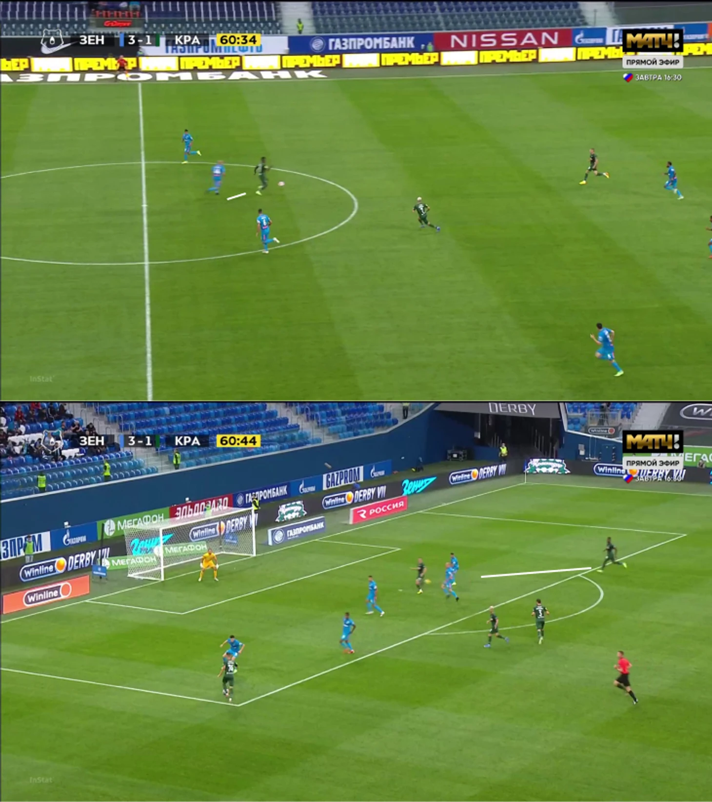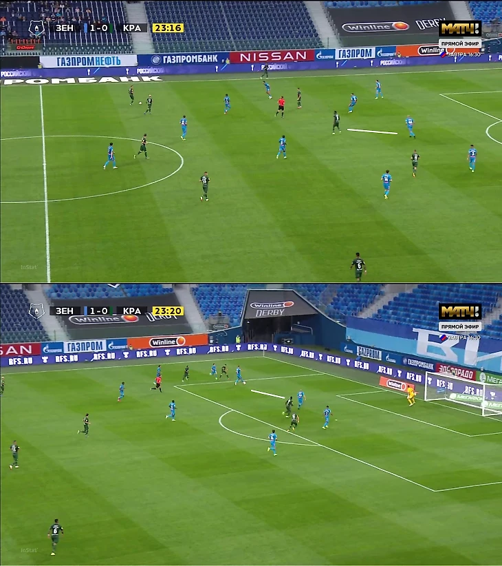 Конкретный пример: Кордоба выманил Ракицкого, развернул его финтом и отдал в свободную середину. «Краснодар» перевел атаку левее – защита «Зенита» тоже сдвинулась в эту зону. Джон ворвался по свободному правому флангу и замкнул навес, но пробил слишком сильно.