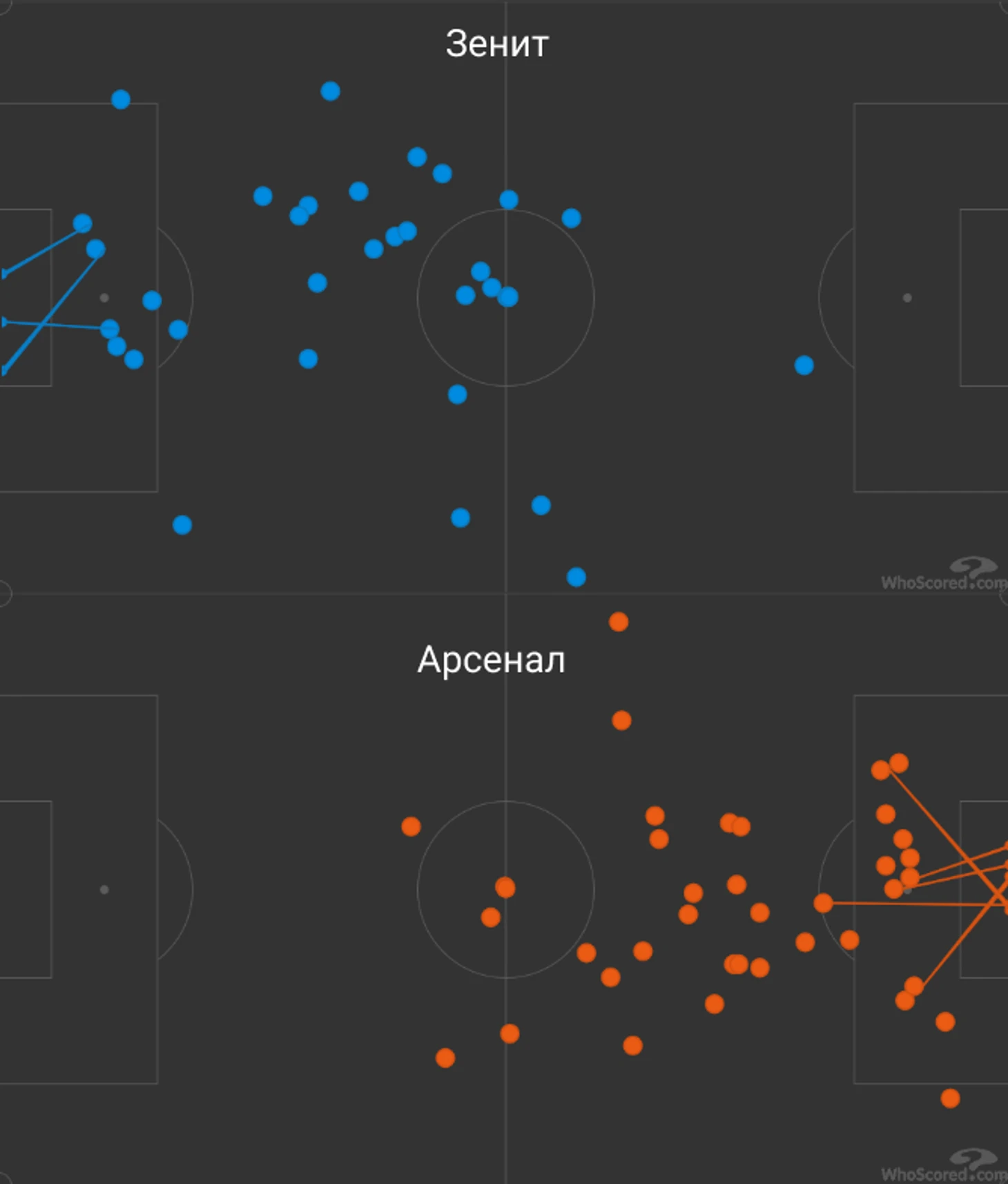 Одна из ключевых особенностей его игры – нацеленность на створ ворот и нахождение параллельно штрафной. Ниже – карта касаний Кордобы в матчах против «Зенита» и «Арсенала».