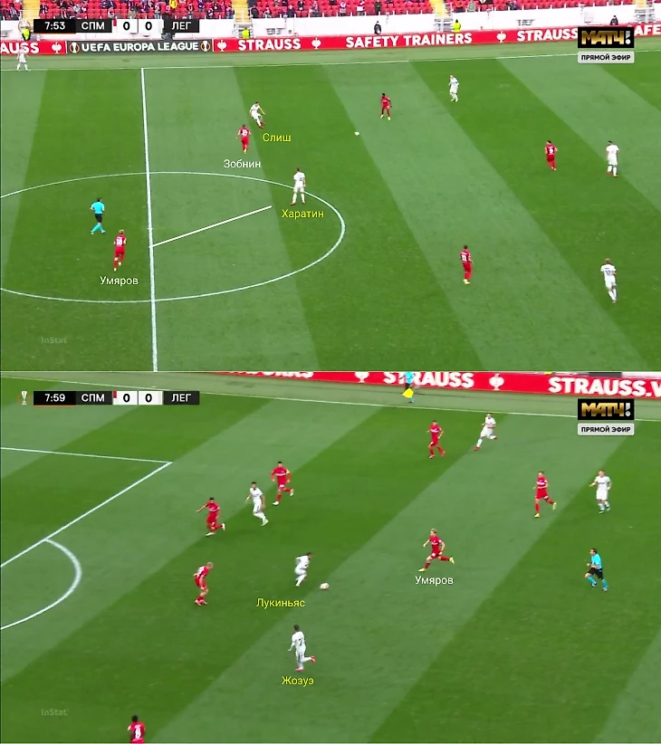 Еще одна проблема – разрозненный прессинг. С одной стороны несколько попыток давления привели к полумоментам «Спартака», с другой – Зобнин/Хендрикс-Умяров смотрелись очень слабо. Например, в первом тайме они теряли прямых оппонентов, упуская их в полуфланги (плюс в некоторых эпизодах не работали механизмы с латералями). Игроки «Спартака» с запозданием среагировали на несколько смещений, тем самым оголяя центр.