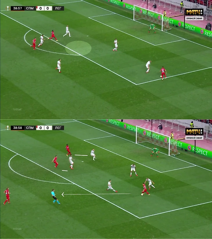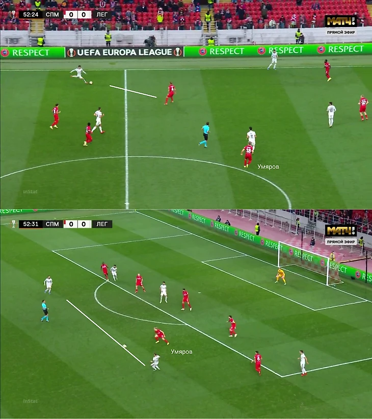 Эпизод охарактеризовал полузащиту «Спартака» с двух сторон. Во-первых, они не всегда разбирали игроков «Легии». Во-вторых, такие ошибки способствовали переводам с одного фланга на другой через отыгранную середину.