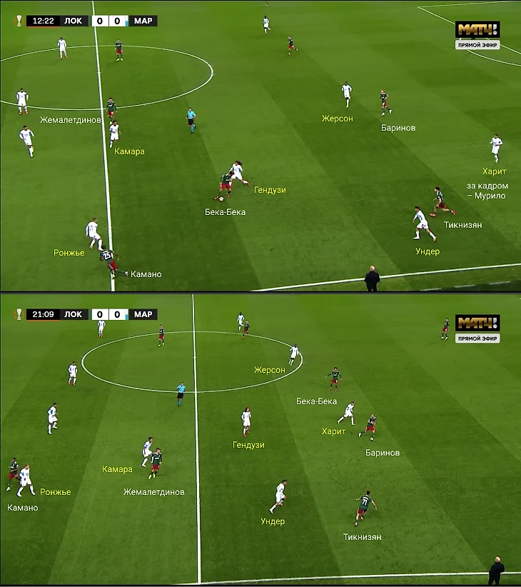 Защитники «Локо» забрасывали вперед, но вингеры теряли мяч. Ситуация упрощалась, когда Жемалетдинов и Камано действовали ближе к центру – точных переводов к ним практически не было, зато снижалась нагрузка на фланговых игроков «Марселя».