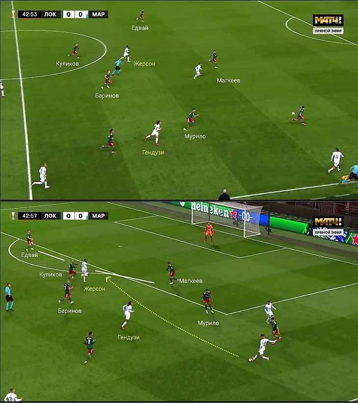 Еще он классно выманил Мурило, найдя слепую зону в полузащите «Локо». Бразилец выдернулся за ним, оставив Магкеева на большом пространстве. Едвай не не подошел ближе к Станиславу, а Куликов упустил рывок Жерсона, но удар получился неопасным.