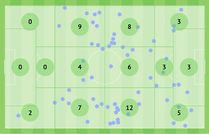 Правда, Николич тоже слукавил касательно выходов из обороны в атаку. Удар Смолова с 25 метров (хоть и в штангу) – слабый аргумент в пользу хороших подходов. «Локомотив» больше не бил в контратаках. Плюс быстрых прорывов практически не было – «Локо» терял мяч в созидании, пытаясь разыгрывать коротко, выводя на продвижение крайних защитников. Дальше искали варианты в центре или на флангах, но именно в таких эпизодах хозяева чаще всего теряли мяч (ниже – карта потерь «Локомотива», основная зона – фланги).