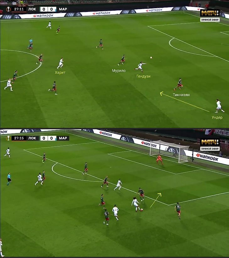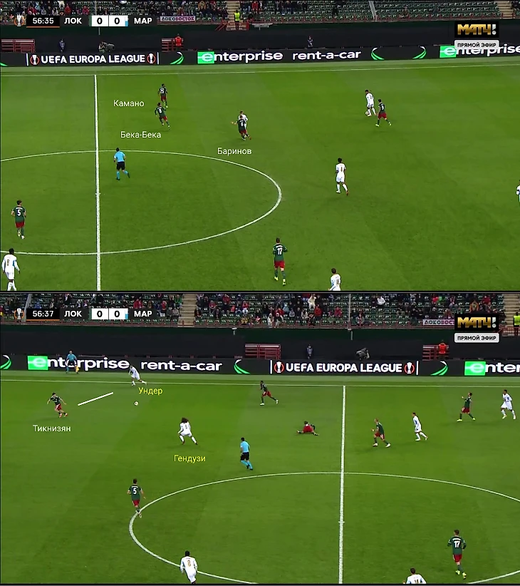 Первый эпизод – его рывок в пару с Харитом. Маттео рванул между Мурило и Тикнизяном, когда «Локомотив» еще не успел сесть в оборону. Его забегание расчистило пространство Ундеру – Наир ждал, куда пойдет передача (пришлось быть в полупозиции из-за Гендузи), а Дженгиз создавал ширину.