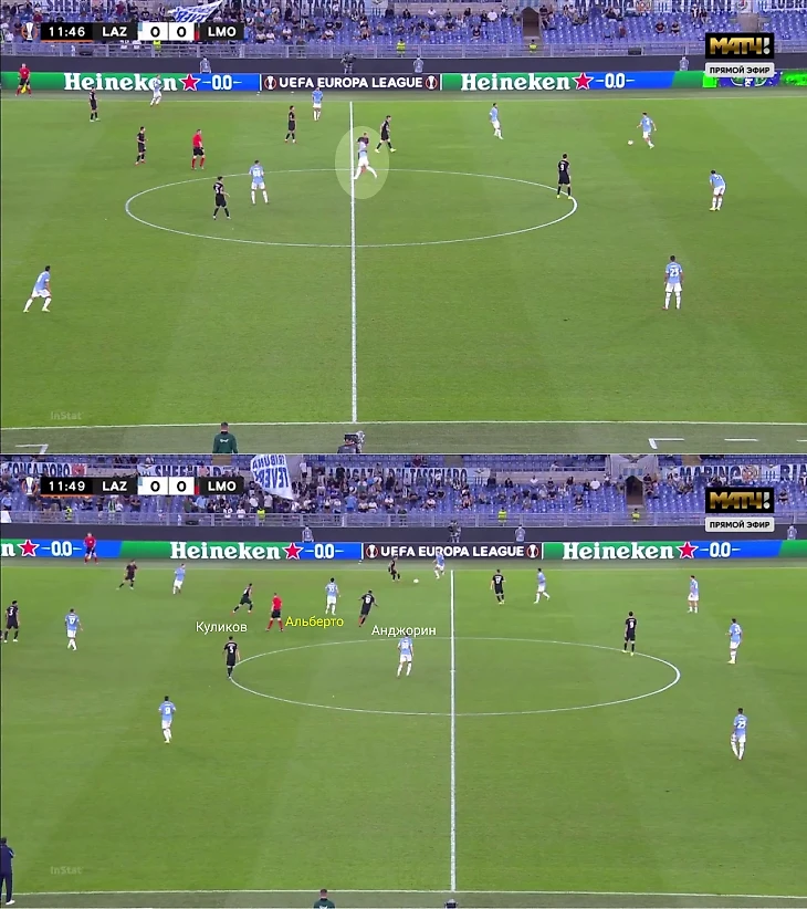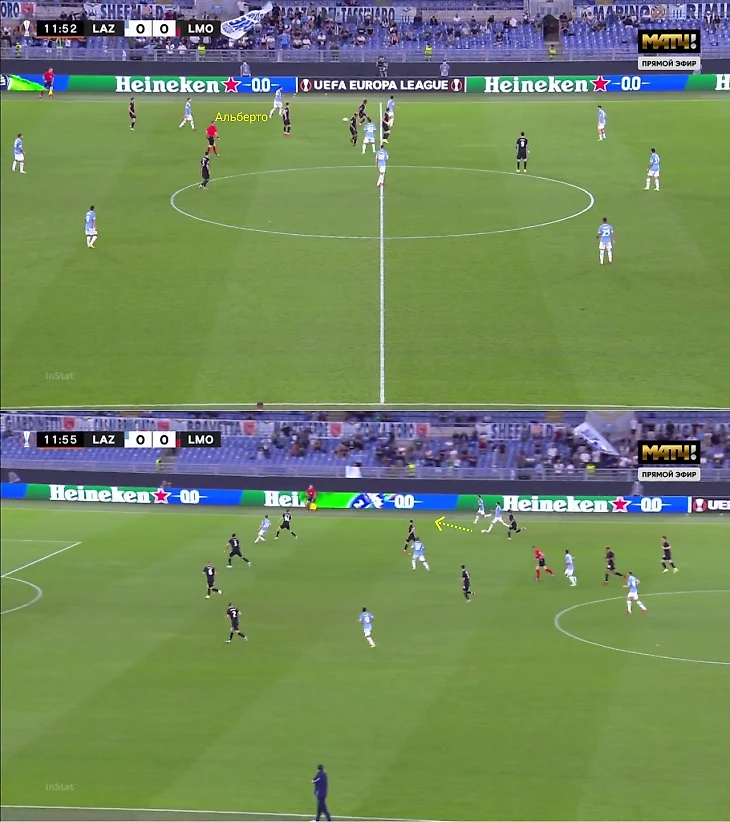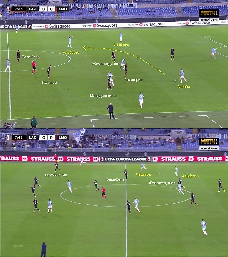 Начало эпизода со скрина выше – прессинг «Локомотива». Сначала гости выжали «Лацио» с фланга Живоглядова, но «Лацио» спокойно перешел на другой – Ладзари и Луис Альберто совершенно свободны, поэтому Ачерби сменил вектор атаки. В итоге пас Альберто разогнал Ладзари, а Рыбчинский и Бека-Бека не смогли его сдержать.