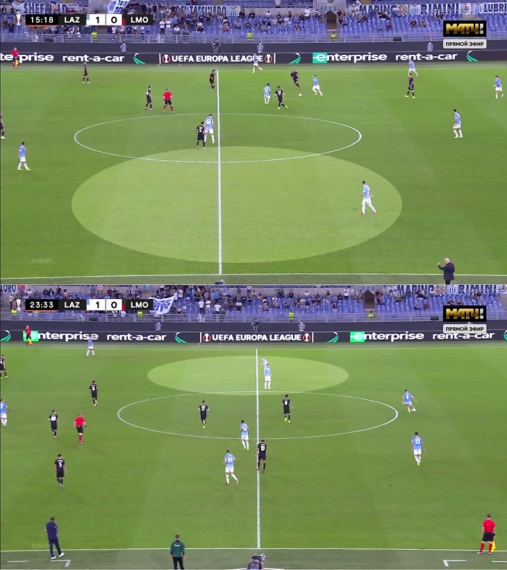 «Лацио» быстро разобрался со схемой. «Локомотив» многое позволял, находясь в поисках компактности при обороне. Например, обороняясь, Жемалетдинов и Анджорин располагались очень узко, плюс Тино периодически терял Альберто. «Лацио» легко этим пользовался – переводили мячи с фланга на фланг, а затем разгонялись в свободных зонах.