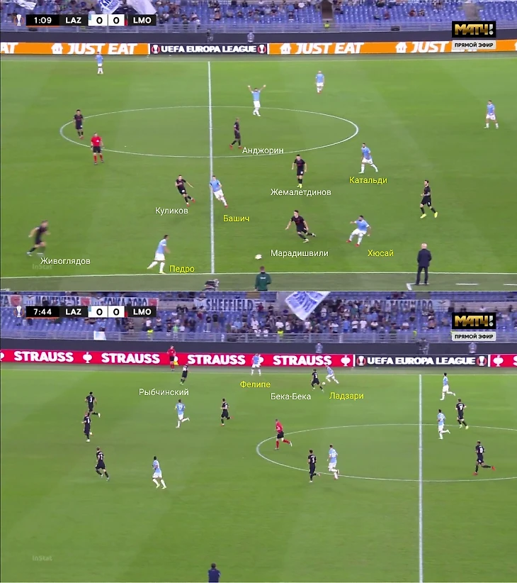 Следующая часть плана – игра по Хюсаю и Ладзари. Левого защитника встречал Марадишвили, правого – Бека-Бека. На скринах ниже виден контраст – справа «Локомотив» давил плотнее, чем слева. В первом случае минимум возможностей для разгона, второй – после перевода с одного фланга на другой (там встречали глубже, так как команда не успевала перестроиться, поэтому фланговые игроки «Лацио» уже набрали скорость).