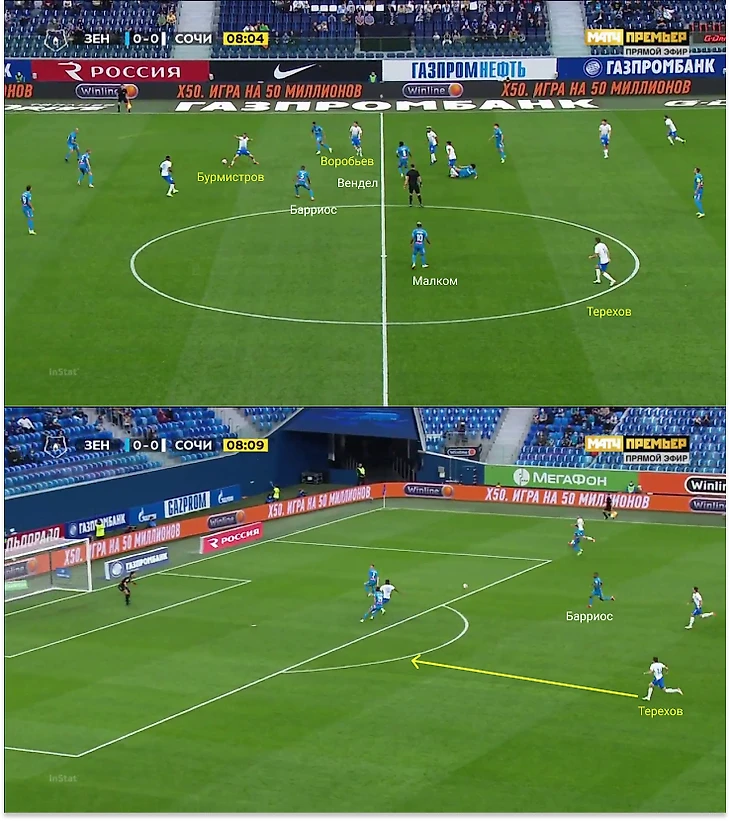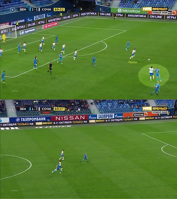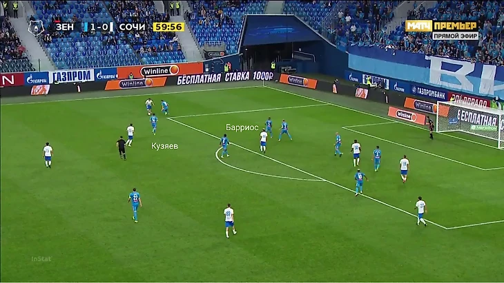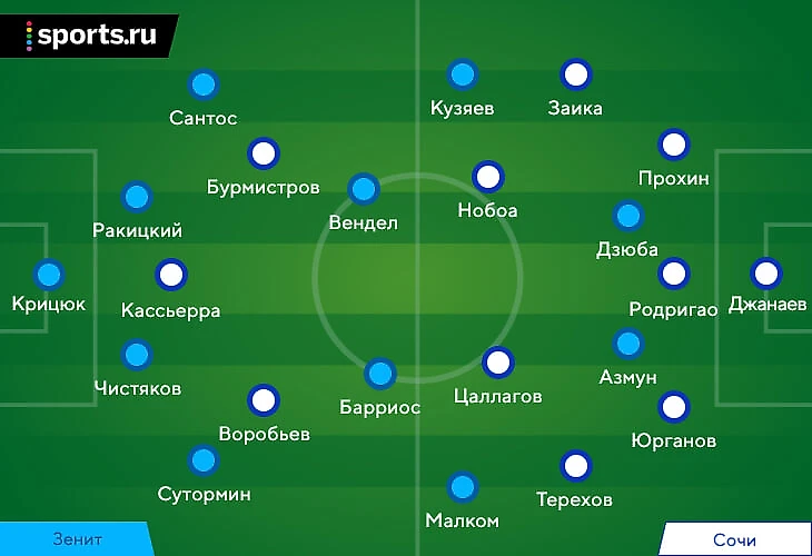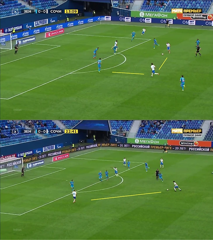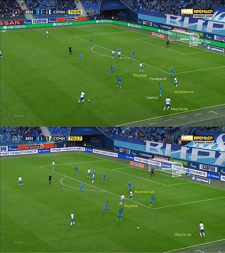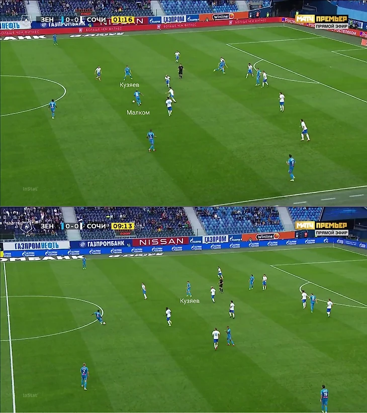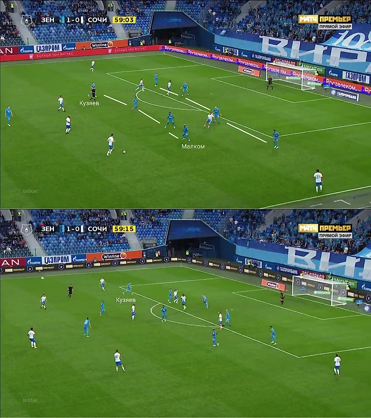 Но две ошибки перевернули ситуацию. Сначала «Зенит» долго подстраивался под Малкома – он застрял слева во время атаки «Сочи», из-за чего не вернулся на правый фланг. «Зенит» вернулся к пятерке через смещение Кузяева.