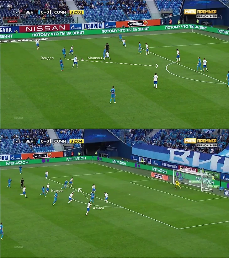 В паре эпизодов старые настройки стали определяющими. Момент Далера Кузяева – эпизод из двух составляющих. Первая – смещение Малкома и Дзюбы на левый фланг. «Зенит» заработал аут, а Малком остался на чужом фланге. Затем он разыграл с Венделом комбинацию, задействовал Дзюбу и Азмуна.