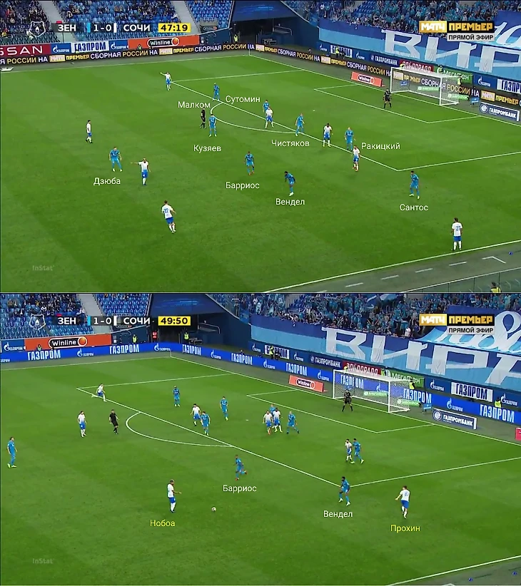 Выглядело максимально просто: Малком и Сантос играли в штрафной, не выбрасываясь к боковой линии – фланговые включения обороняли Вендел и Кузяев. По ходу эпизода к одному из разыгрывающих включался Дзюба (но не всегда), плюс поджимал Барриос.