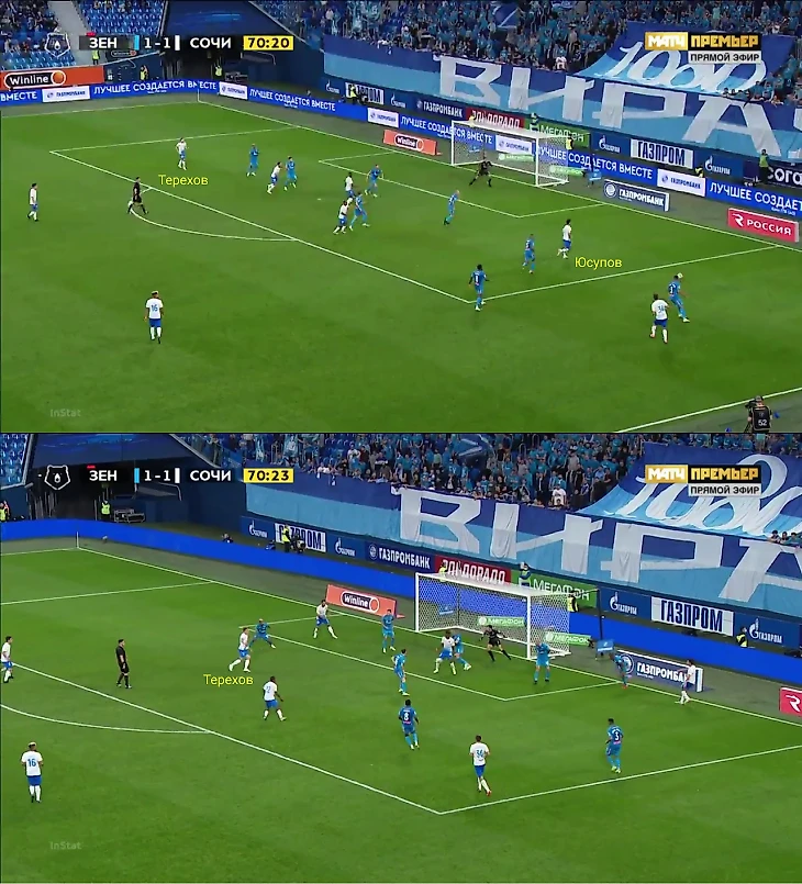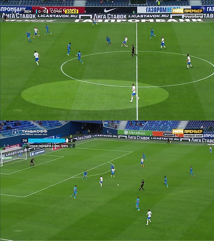 В первые 20 минут «Зенит» практически не испытывал проблем. «Сочи» сделал 12 подач в штрафную, но они были бесполезными – команда Сергея Семака, если и позволяла принимать мяч, то только спиной к воротам. «Сочи» до гола сделал всего 6 касаний в чужой штрафной: 3 – передачи назад из нее, 1 – неудачный кросс, 1 – безуспешное касание, 1 – удар (тема ошибок «Зенита» – ниже»).
