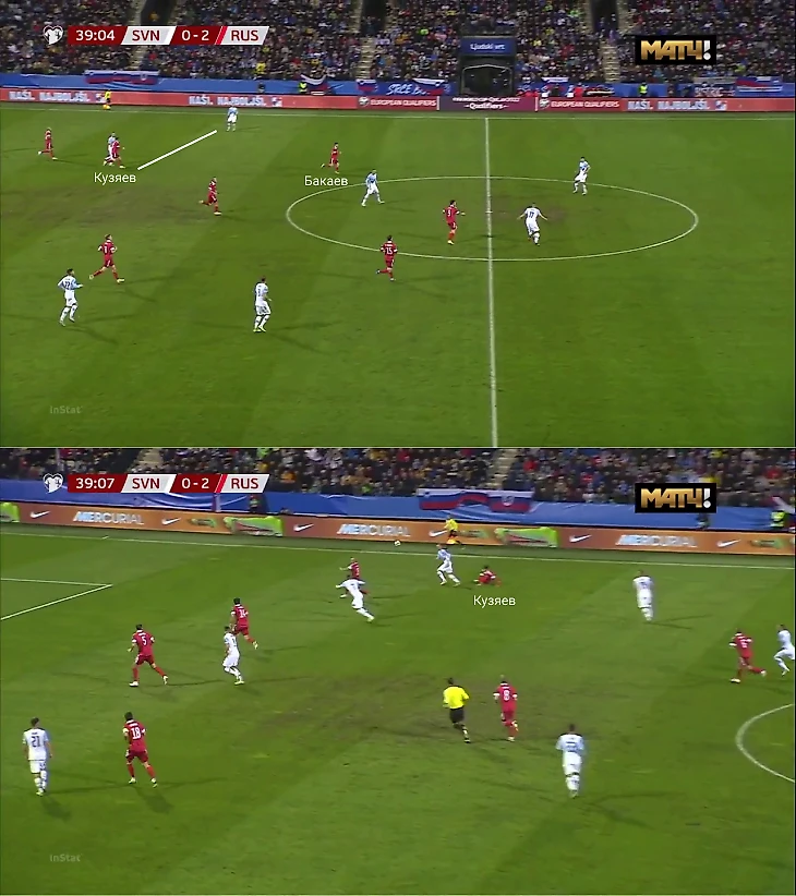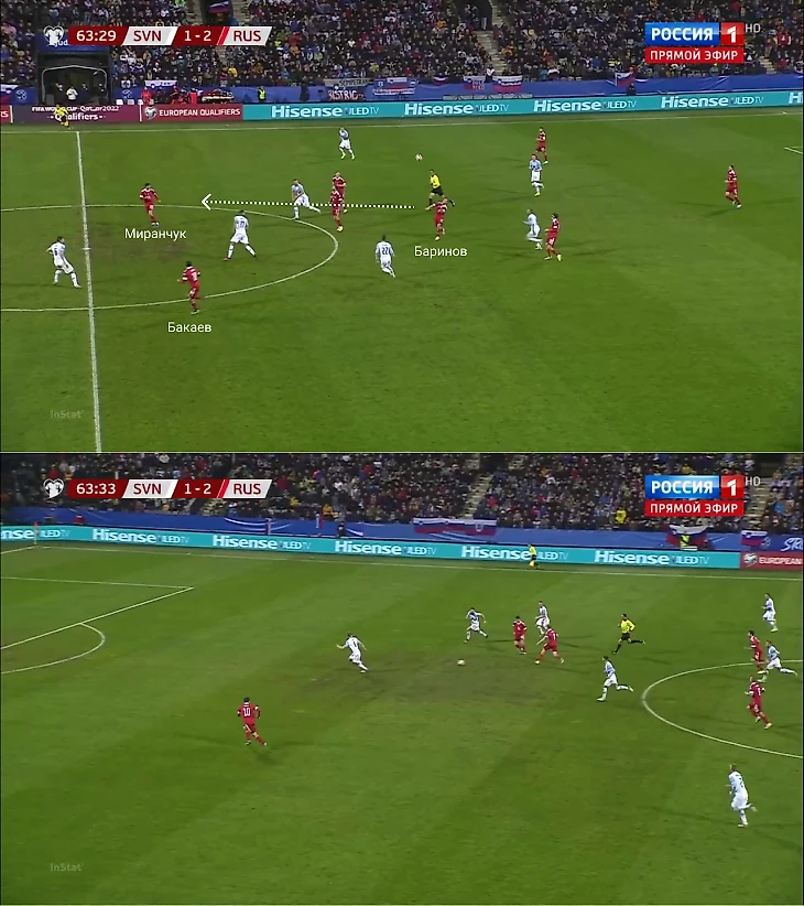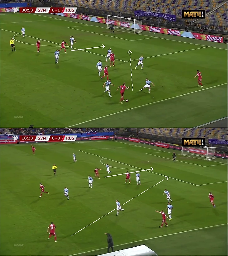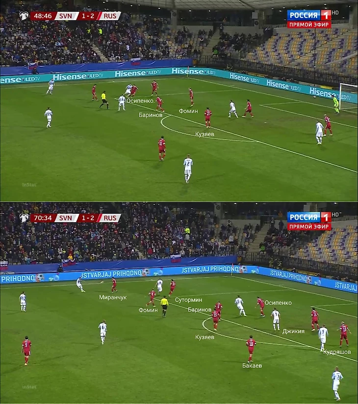 Прессинг-установки нашей сборной уже все выучили: Бакаев и Миранчук атаковали центральных защитников при передачах назад и длительном владении, Смолов – по одному из опорников (плюс начинал давление на вратаря), Фомин и Кузяев страховали фланги, а Баринов регулярно им помогал. У Словении были неприятные прецеденты с длительным владением. Например, Смолов и Бакаев чуть не организовали пенальти.