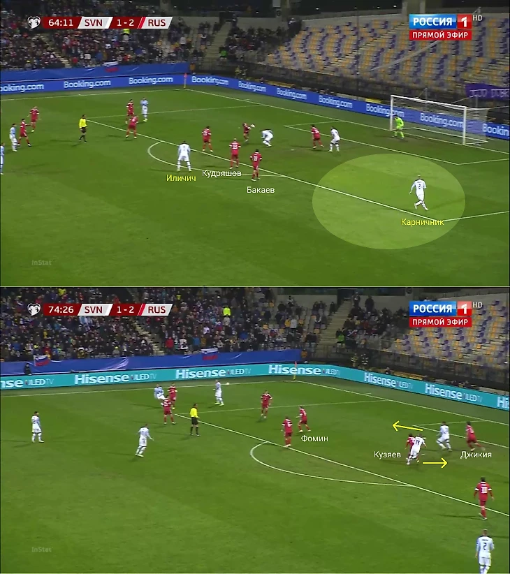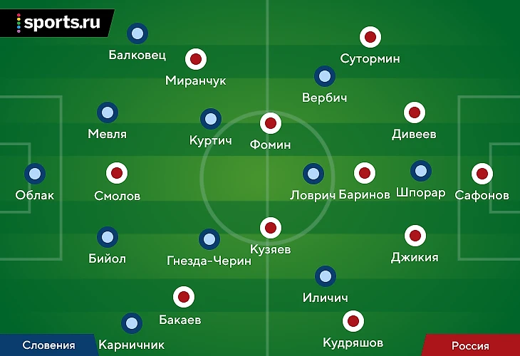 В Словении Карпин сделал несколько перестановок. Возвращение Миранчука изменило фланги: Алексей играл справа, Бакаев – слева. Фомин вышел вместо Ерохина, Кудряшов занял позицию Терехова.