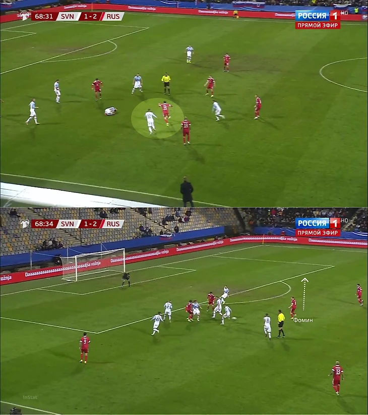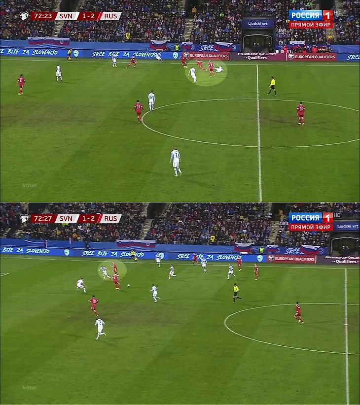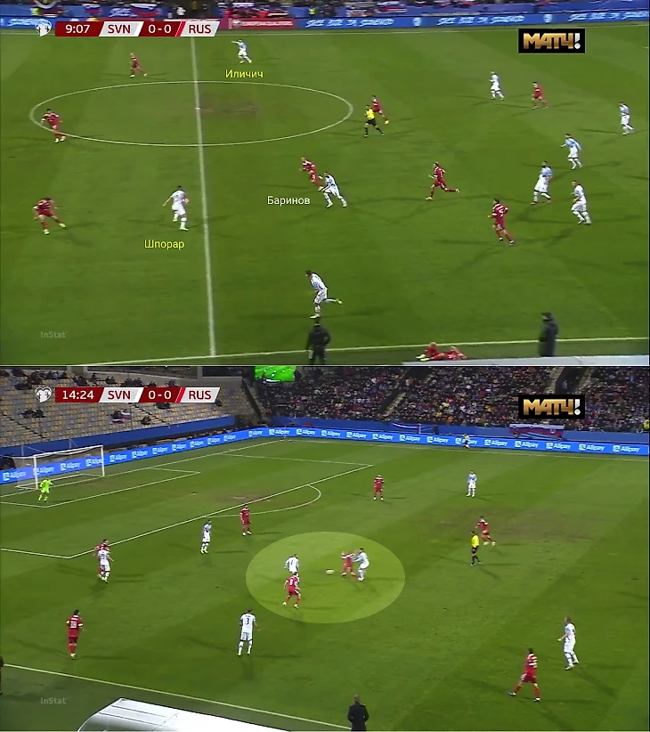Другой опасный момент – совмещение контпрессинга и борьбы. В первом случае Россия и Словения боролись за мяч после выноса. Гости вроде как закрепились, но Сутормин сделал неточную передачу, плюс получил по ногам – так Словения выбежала в быструю атаку. Шпорар грамотно открылся, а затем перевел на Иличича, который эффектно вбежал в штрафную.