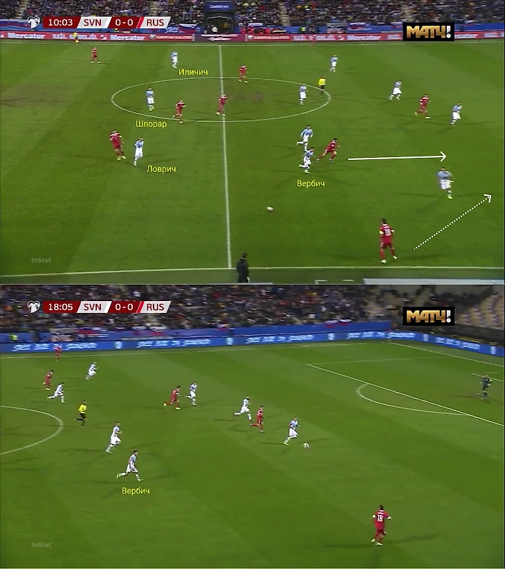 Позиция Вербича была сложнее – в некоторых эпизодах Ловрич выбрасывался в пару к Шпорару. Их достаточно легко отрезали, поэтому Вербич смещался в середину или полуфланг, тем самым открывая зону для включений Сутормина (в некоторых эпизодах Вербич тоже поднимался высоко, ориентируясь на Дивеева).