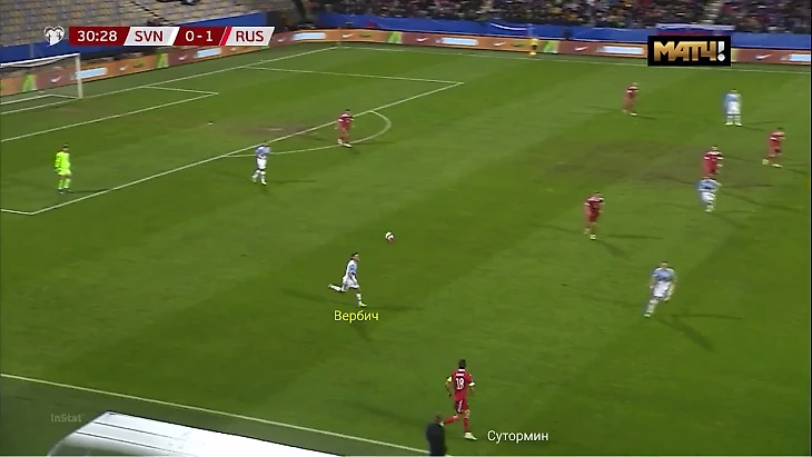 А теперь про хорошее. Классный прием России при владении – использование прессинг-особенностей Словении. Вертикальное продвижение не шло, зато мы были хороши на флангах.