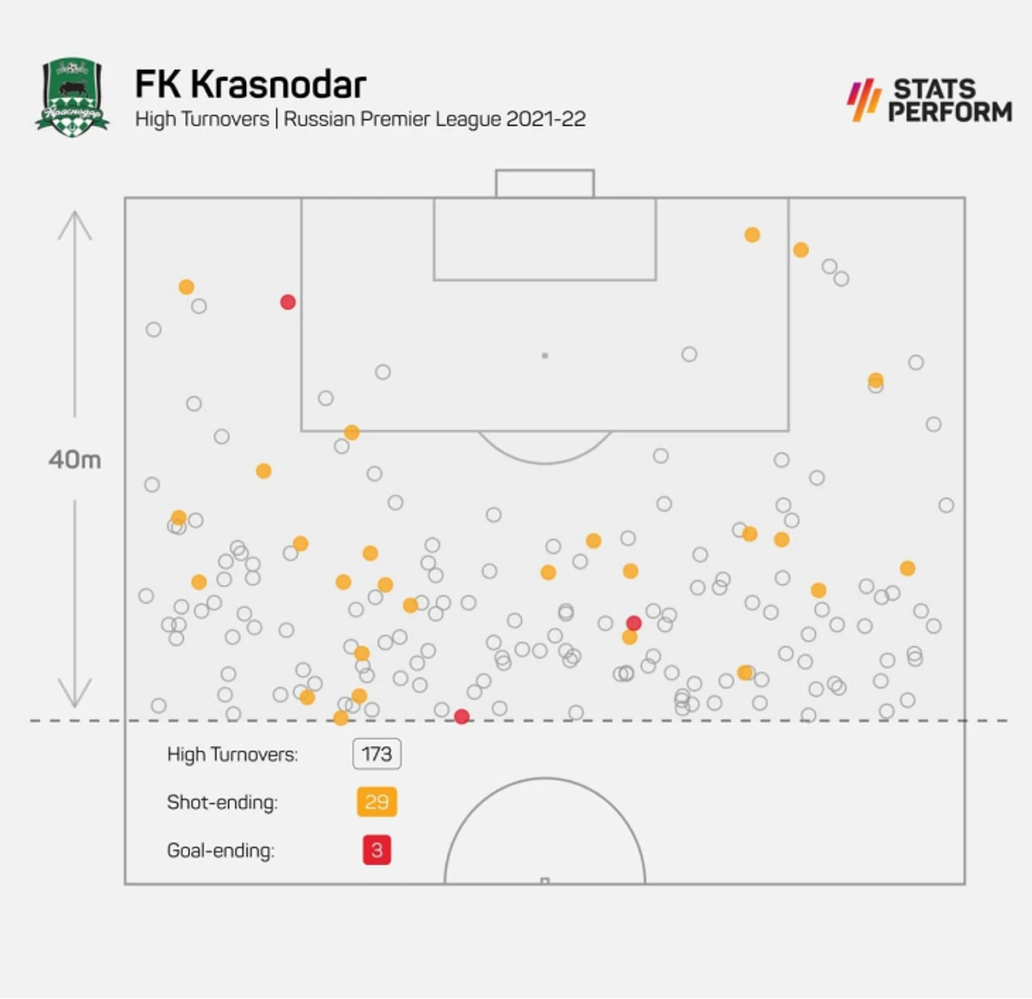 Агрессию подчеркивают прессинг-показатели. «Краснодар» – лидер РПЛ по числу атак после высоких перехватов (отборы, перехваты, возвраты владения в 40 метрах от чужих ворот, которые привели к атакам с игры).