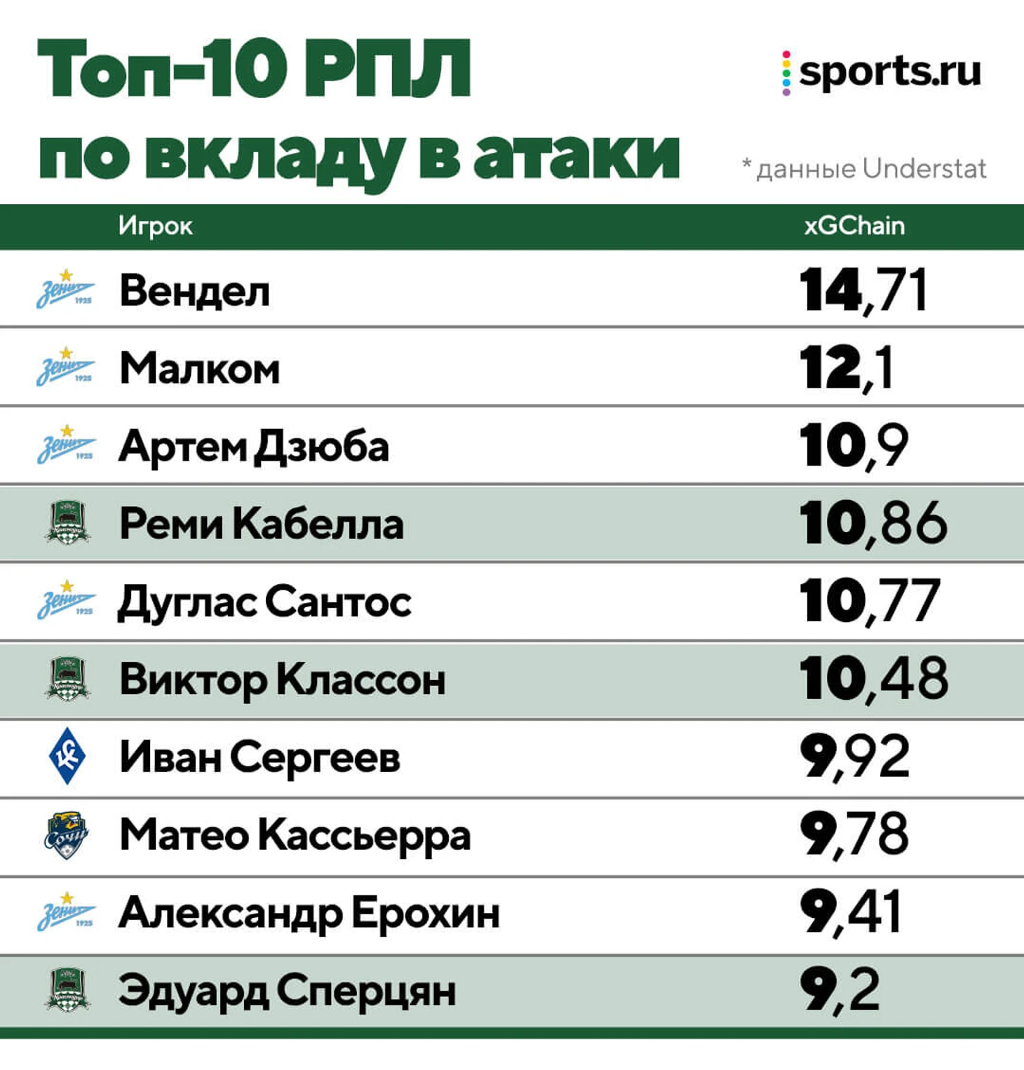 Кабелла, Классон и Сперцян – единственное массовое представительство в топ-10 по xGChain (вклад в атаки с ударами, включающий и промежуточный пас или касание, и передачу под удар, и сам удар) не из «Зенита».