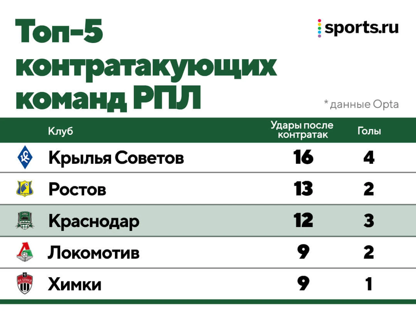 Игры с «Локо» (1:2), ЦСКА (0:0) и «Химками» (3:3) наглядно показали еще пару проблем. Во-первых, после своих атак «Краснодар» подвержен ответным контратакам (11-е место в РПЛ по допущенным ударам после контратак).