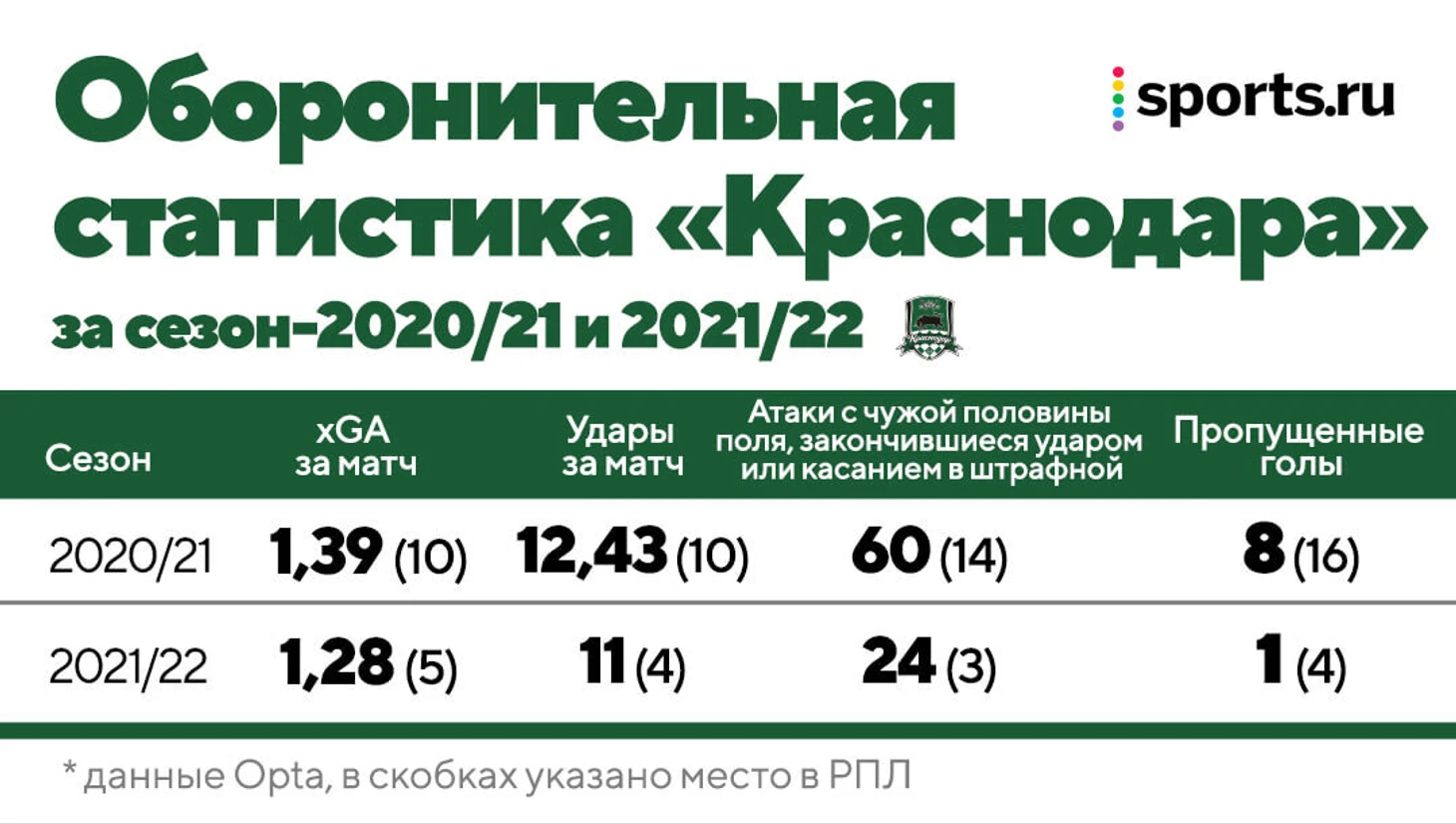 В прошлом сезоне «Краснодар» был одним из худших по допуску атак, которые начинались с чужой половины поля, а заканчивались ударом или касанием в чужой штрафной (Direct attack against, 14-й – по количеству, 16-й – по пропущенным голам). Теперь «Краснодар» гораздо реже проваливался в прессинге и при позиционной обороне – команда входит в топ-5 по количеству допущенных атак и пропущенных после них голов (Direct attack goals against).