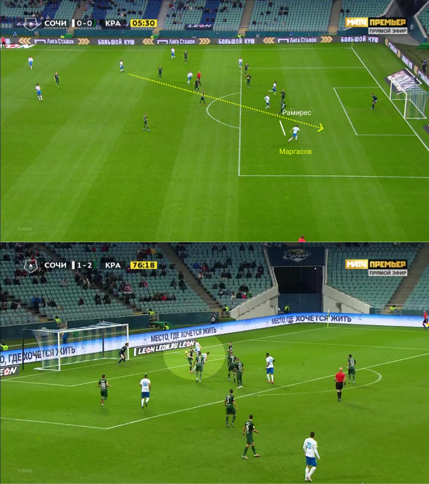 Такие результаты спровоцировала смена стиля «Краснодара» – команда не стесняется длинных передач. Крыховяк искал мощного Кордобу, а также убегающих Кабелла и Ионова. Например, гол Кабелла «Сочи» в первом круге – результат передачи Крыховяка на 40 метров, а победный Классона во втором – рывок Ионова за спину защитникам (2:1).