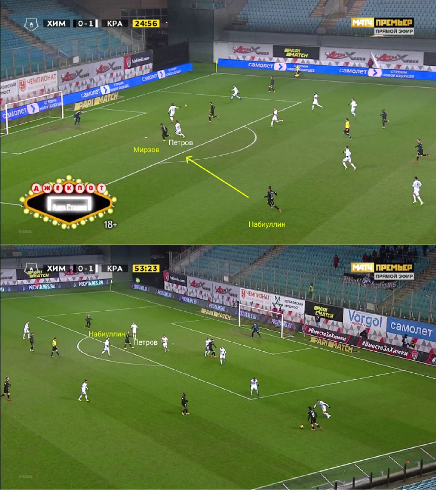 Первый пример – контратака «Химок», где Петрову не помогли проконтролировать спину (Набиуллин немного не успел на отскок), второй пример – пропущенный гол (Петров не среагировал на Набиуллина).