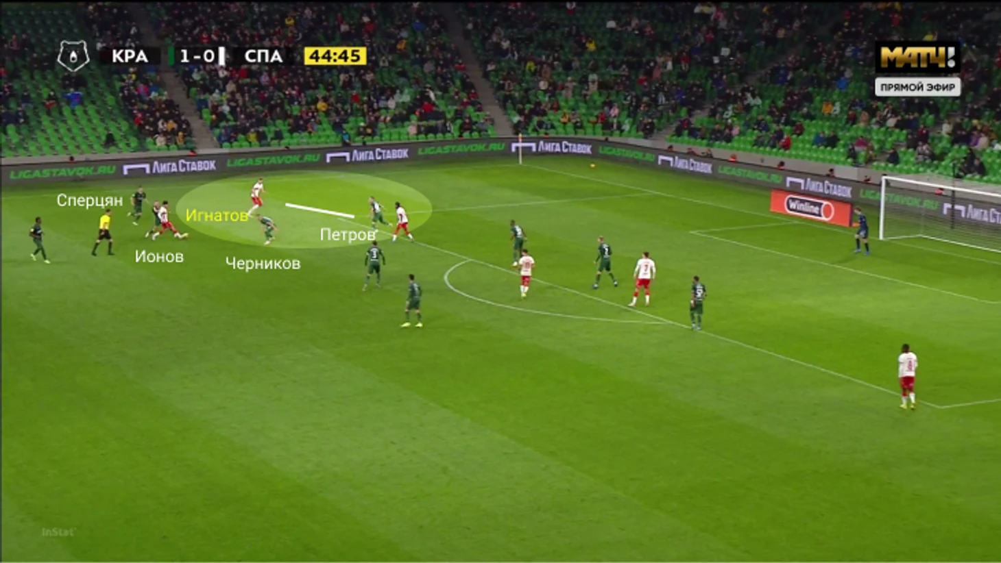 Например, «Спартак» заработал пенальти благодаря свободному флангу – Промес увел Петрова, а Игнатов свободно вошел в штрафную.