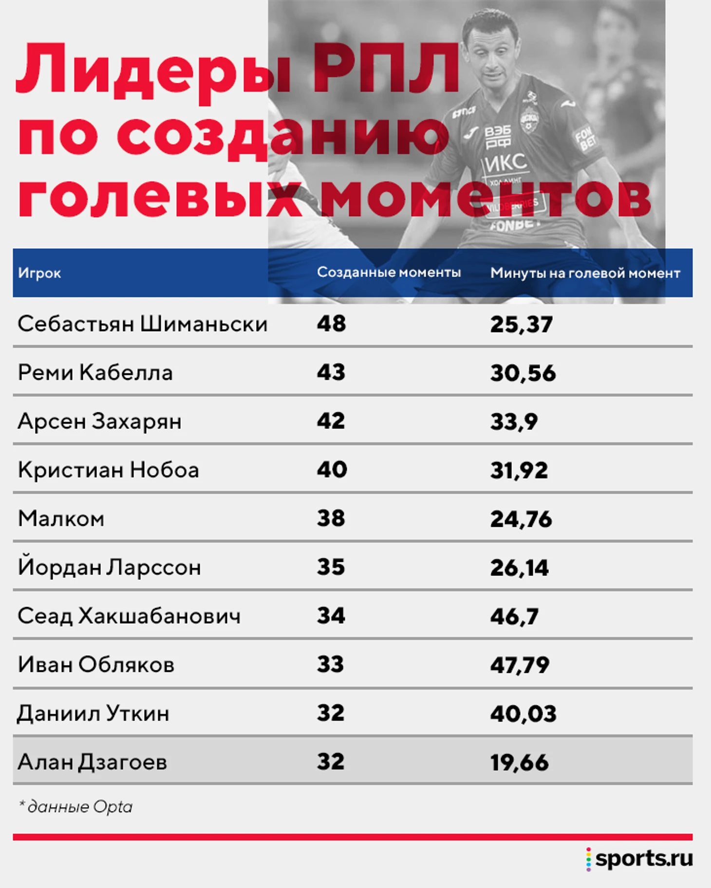 В этом сезоне Дзагоев сыграл 629 минут, но все равно выходит в топ-10 созидателей лиги. Алану требовалось менее 20 минут на создание голевого момента – это лучший результат. Он гораздо быстрее всех партнеров (47,79 – результат Облякова, 33,93 – Ахметова, 73 – Заболотного, 55 – Чалова).