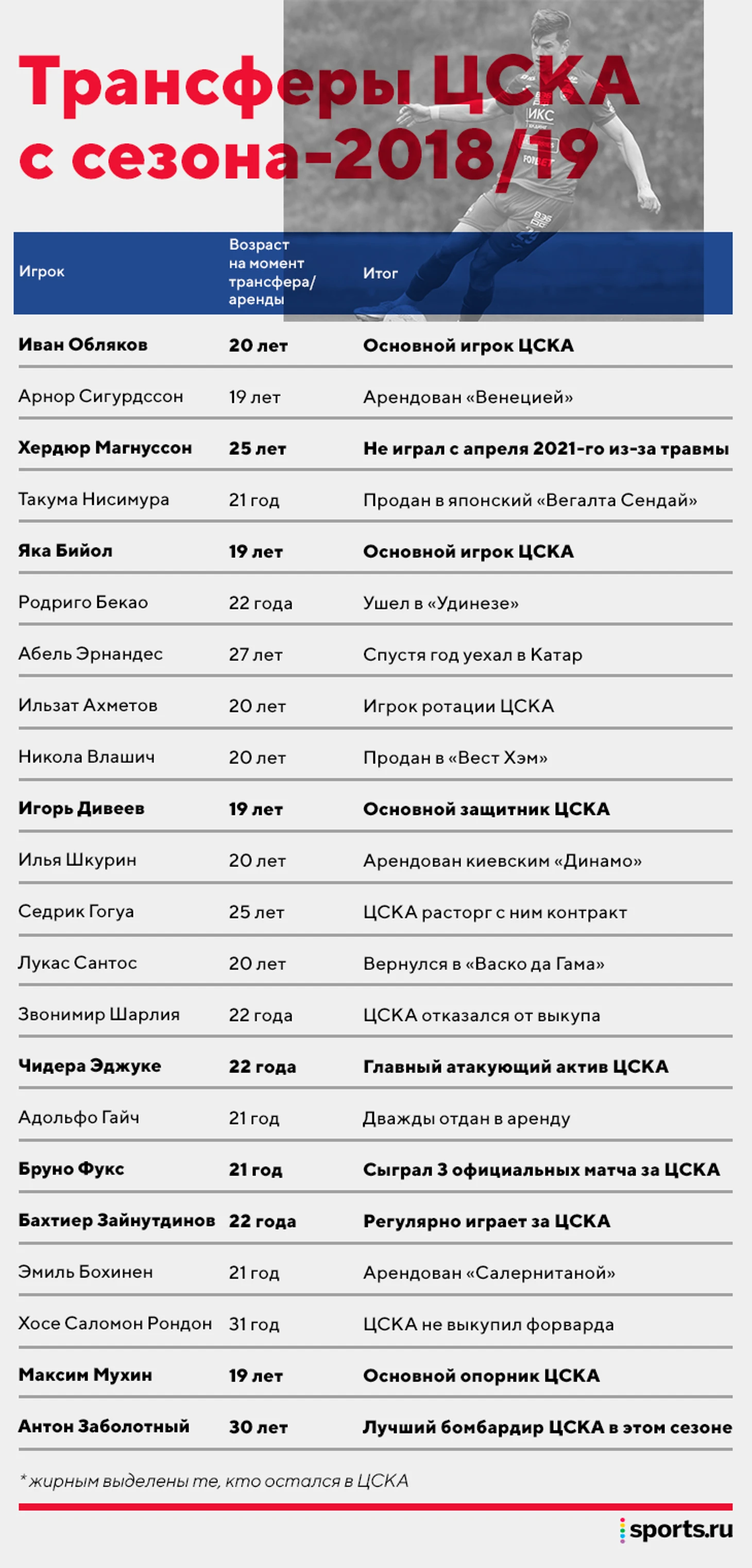 Итог – кадровый голод команды на фоне старения лидеров. По сути, с 2018-го ЦСКА приобрел только троих футболистов, способных делать разницу: Влашича, Эджуке (не сразу заиграл) и Заболотного (зависим от остальной команды). Остальные пока не дотягивают до топ-уровня РПЛ.