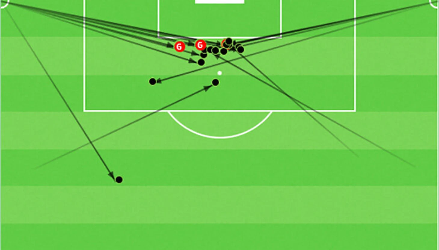 Ниже – графика подач Дзагоева, где черные точки – удары по воротам, красные – голы.
