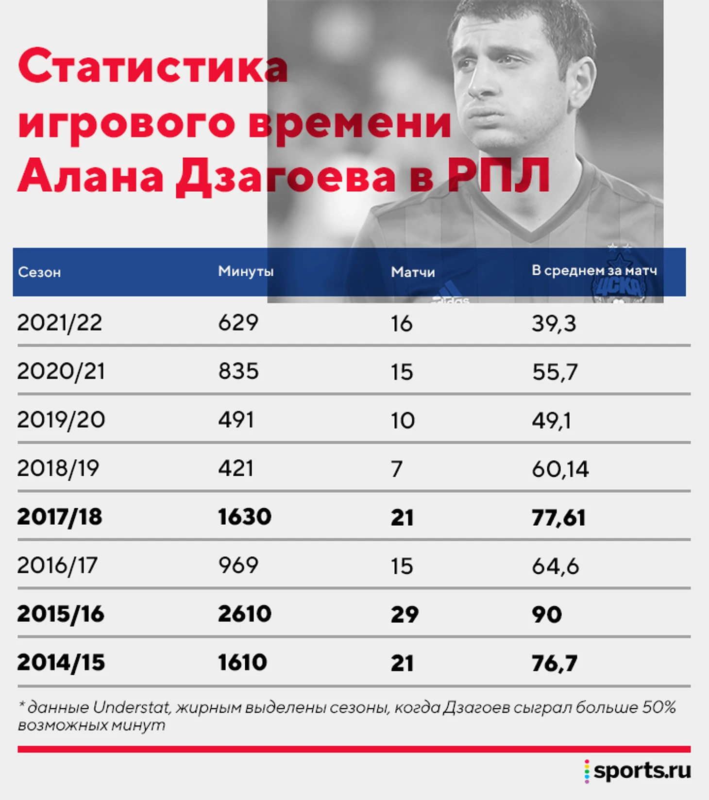 Ключевая проблема Дзагоева – постоянные травмы. Последний раз Алан проводил на поле более 75% игрового времени в сезоне-2015/16, больше 50% – перед домашним чемпионатом мира. В следующих сезонах Дзагоев играл меньше 20% возможных минут.