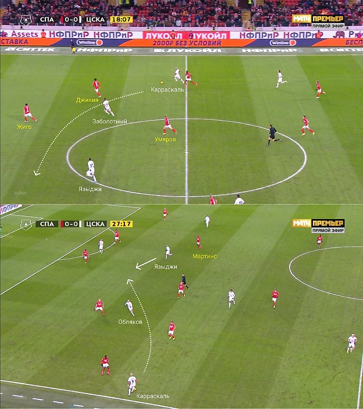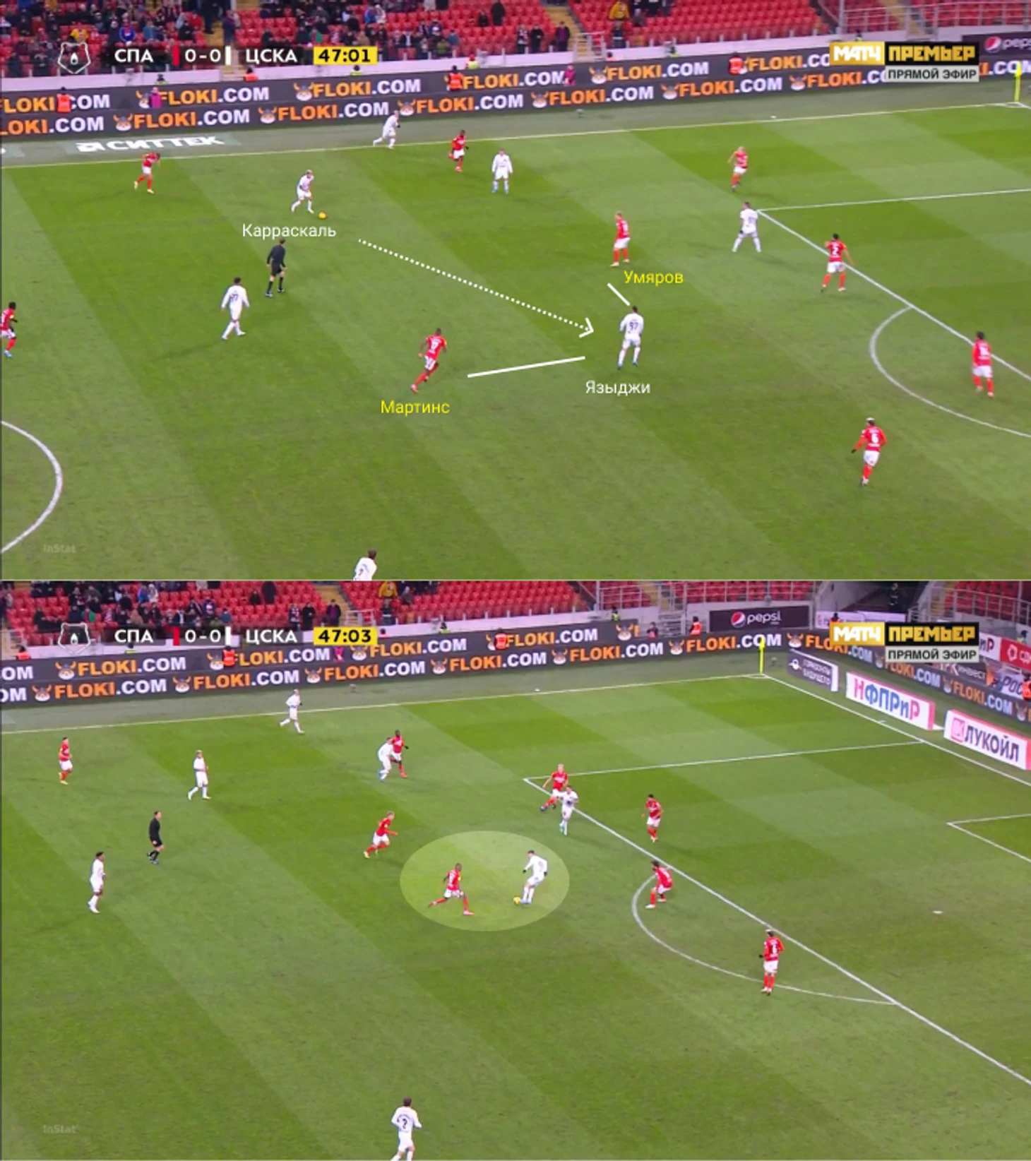 Ниже – два примера. В первом эпизоде Языджи участвовал в контратаке: сориентировался по Заболотному и Карраскалю, на которых выдвинулись Жиго, Джикия и Умяров (забегал чуть левее, похожий эпизод был и против «Локо», но Эджуке решил эпизод сам). Во втором – оторвался от Кристофера Мартинса. Языджи прочитал свободную зону, после чего скинул головой на рывок Облякову.