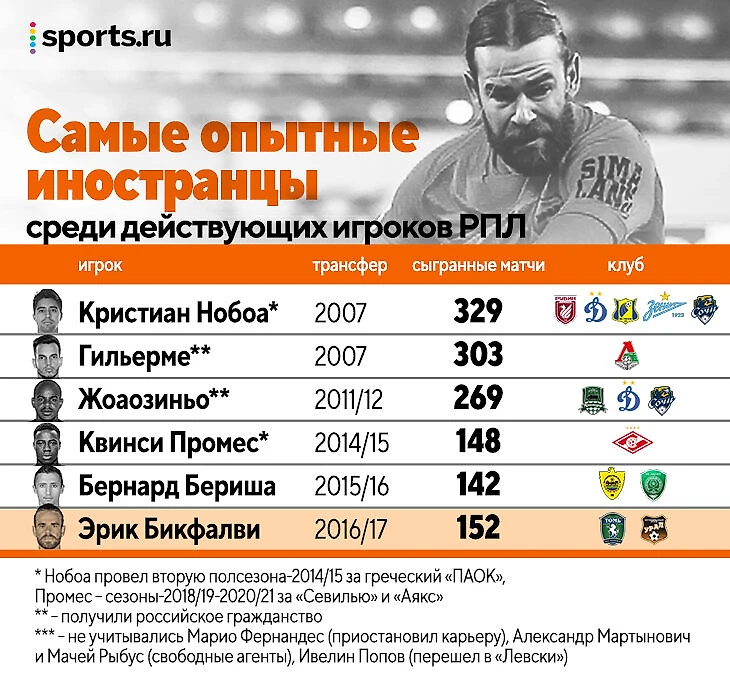 Легионеры нечасто так привязываются к региональным командам, а Бикфалви – в топе иностранцев по длительности пребывания в РПЛ. Бикфалви – знаковая фигура для нашей лиги. Румын переехал в Россию в сезоне-2016/17 – раньше здесь оказались только Кристиан Нобоа, Александр Мартынович (свободный агент после ухода из «Краснодара»), Мачей Рыбус (свободный агент, покинул «Локомотив»), Ивелин Попов (после завершения сезона перешел в «Левски»), Квинси Промес плюс натурализованные Гильерме, Жоаозиньо и Марио Фернандес (приостановил карьеру).